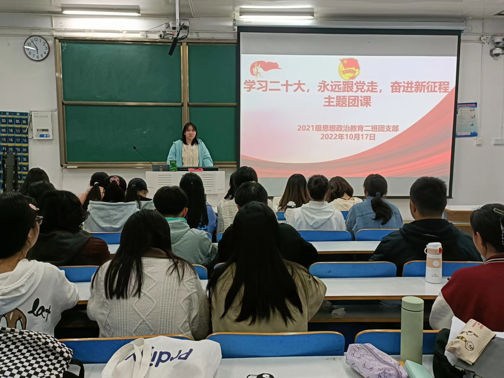 10月17日下午,pp电子官方网站2021级思想政治教育二班在社科楼514教室召开“学习二十大,永远跟党走,奋进新征程”主题团课。2021级思想政治教育二班全体团员参加此次团课。团课由团支书王婧欣主持。