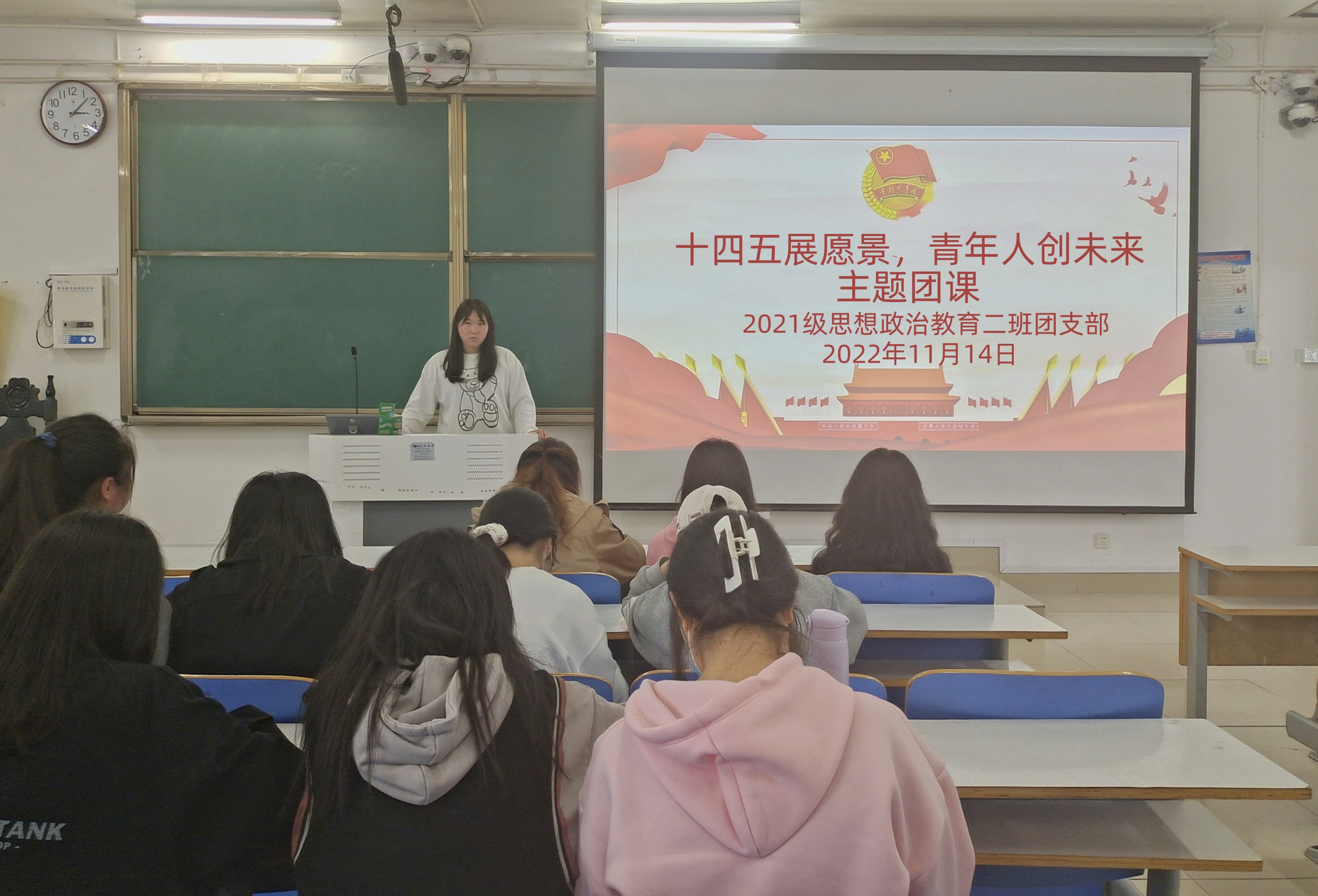 11月14日下午,pp电子官方网站2021级思想政治教育二班在社科楼514教室召开“十四五展愿景,青年人创未来”主题团课。2021级思想政治教育二班全体成员共同参加本次主题团课。团课由团支书王婧欣主持。