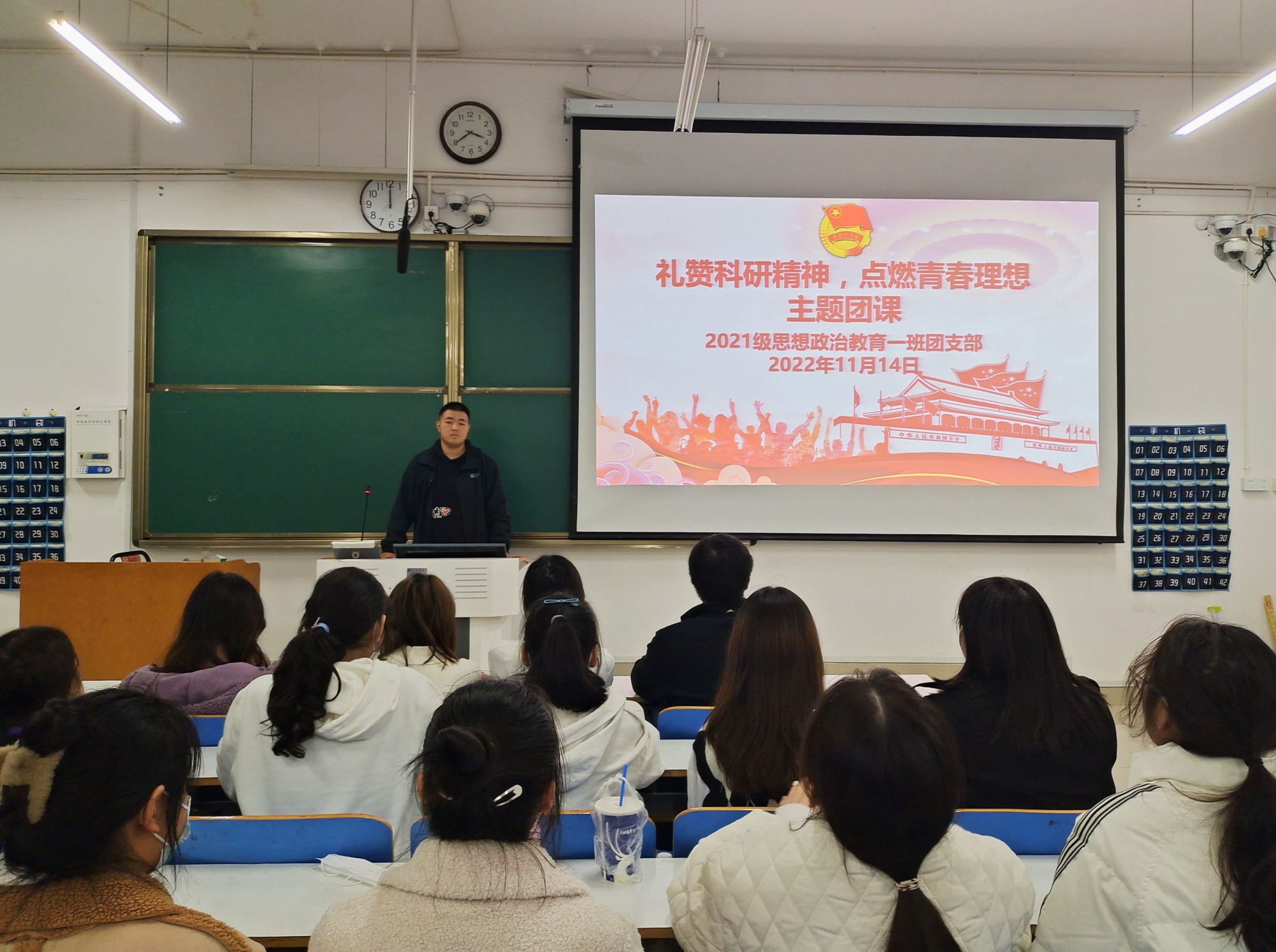 11月14日下午,pp电子官方网站2021级思想政治教育一班在社科楼416教室召开“礼赞科研精神,点燃青春理想”主题团课。2021级思想政治教育一班全体团员共同参与本次团课。团课由团支书戴翰林主持。
