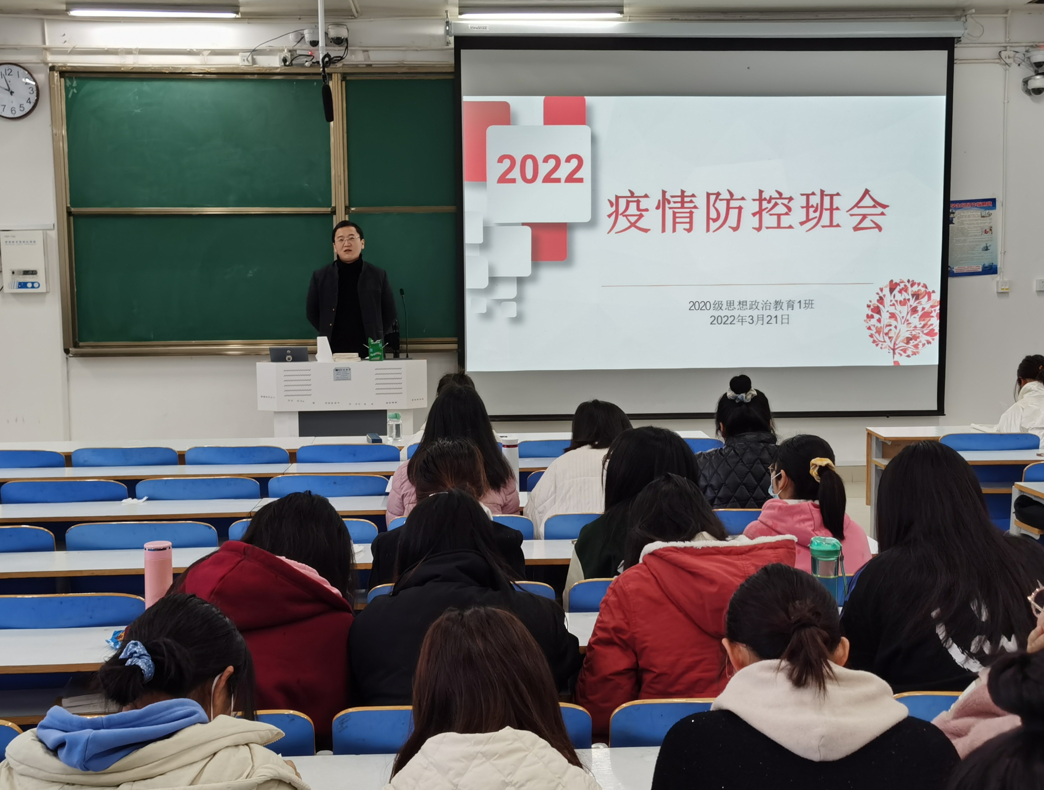 3月21日上午,pp电子官方网站2020级思想政治教育一班、定向一班在社科楼514教室召开“疫情防控”主题班会。pp电子官方网站2020级思想政治教育一班、定向一班全体同学参加了本次班会,班会由辅导员曹栋主持。