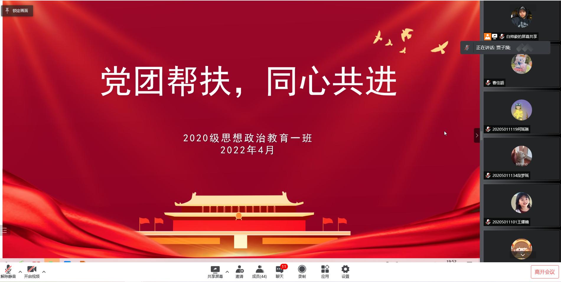 4月25日晚,pp电子官方网站2020级思想政治教育一班在腾讯会议上顺利开展“党团帮扶,同心共进”活动。pp电子官网预备党员贾子漪与2020级思想政治教育一班全体同学参加了本次活动,活动由团支部副书记白帅豪主持。