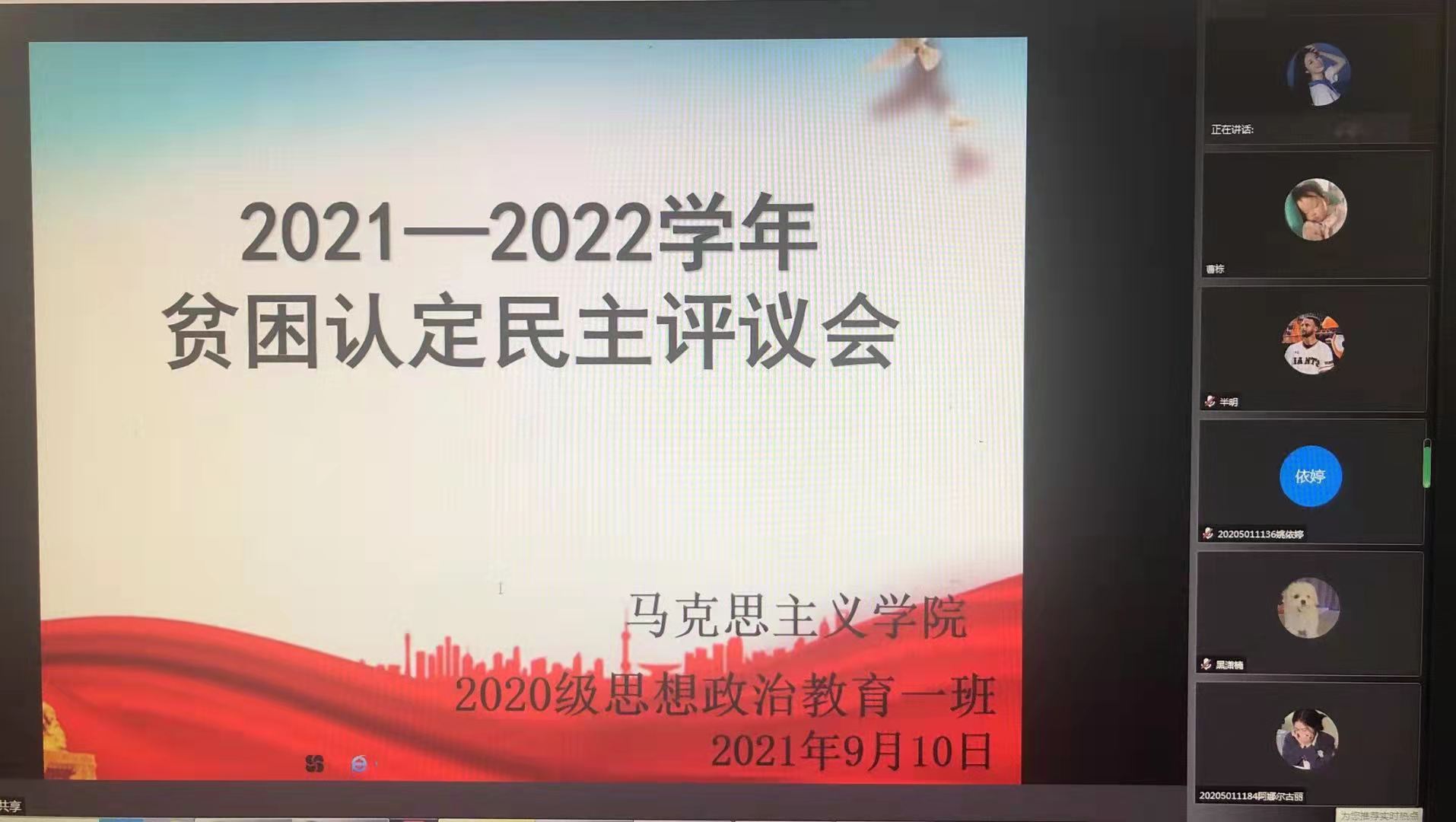 9月10日上午,pp电子官方网站2020级思想政治教育一班通过腾讯会议线上平台顺利开展2021—2022学年贫困认定民主评议会。辅导员曹栋、评议小组成员、申请人以及监督人员参与了本次会议,本次会议由团支书卢茜雨主持。