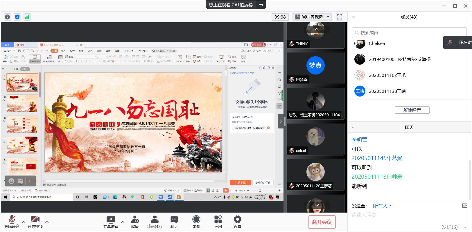9月18日,pp电子官方网站2020级思想政治教育一班在腾讯会议上召开“九一八勿忘国耻”团课。2020级思想政治教育一班全体同学参加此次团课,团课由团支书卢茜雨主持。