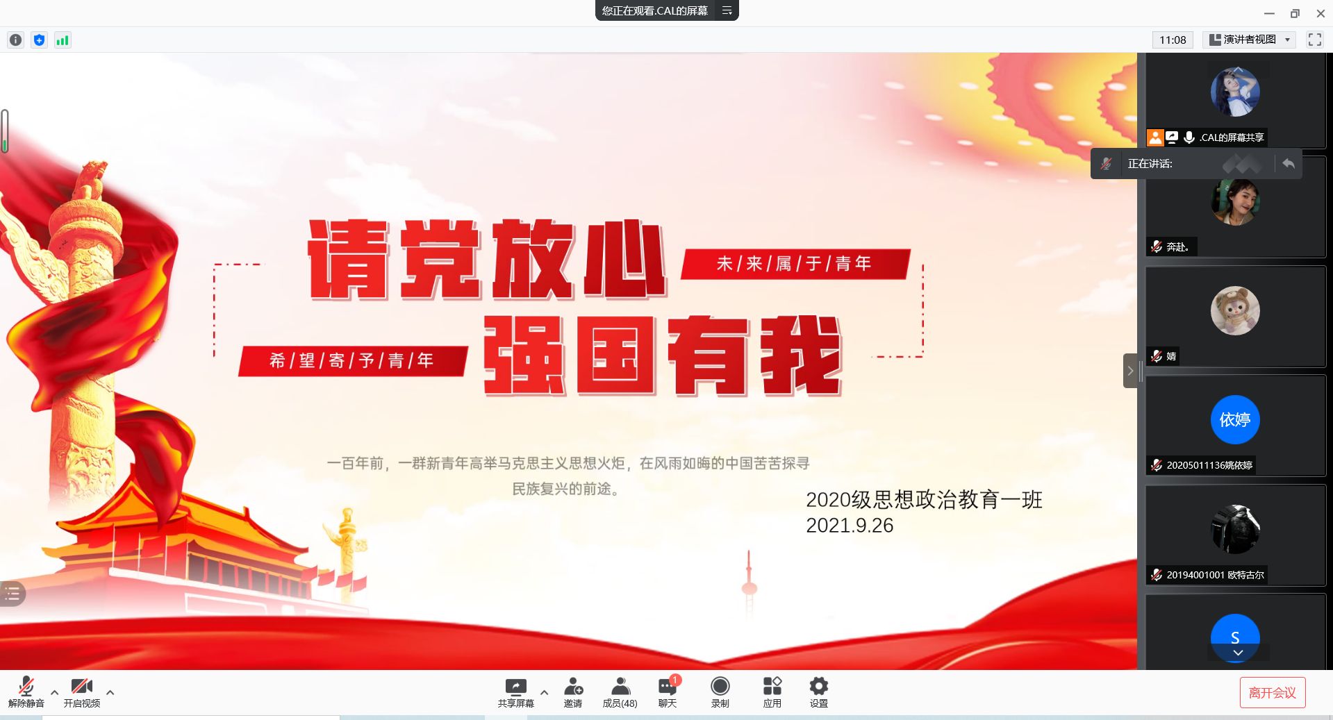 9月26日晚上,pp电子官方网站2020级思想政治教育一班在腾讯会议上召开主题为“请党放心,强国有我”的团支部大会。2020级思想政治教育一班全体同学全程参加本次团支部大会,大会由团支书卢茜雨主持。