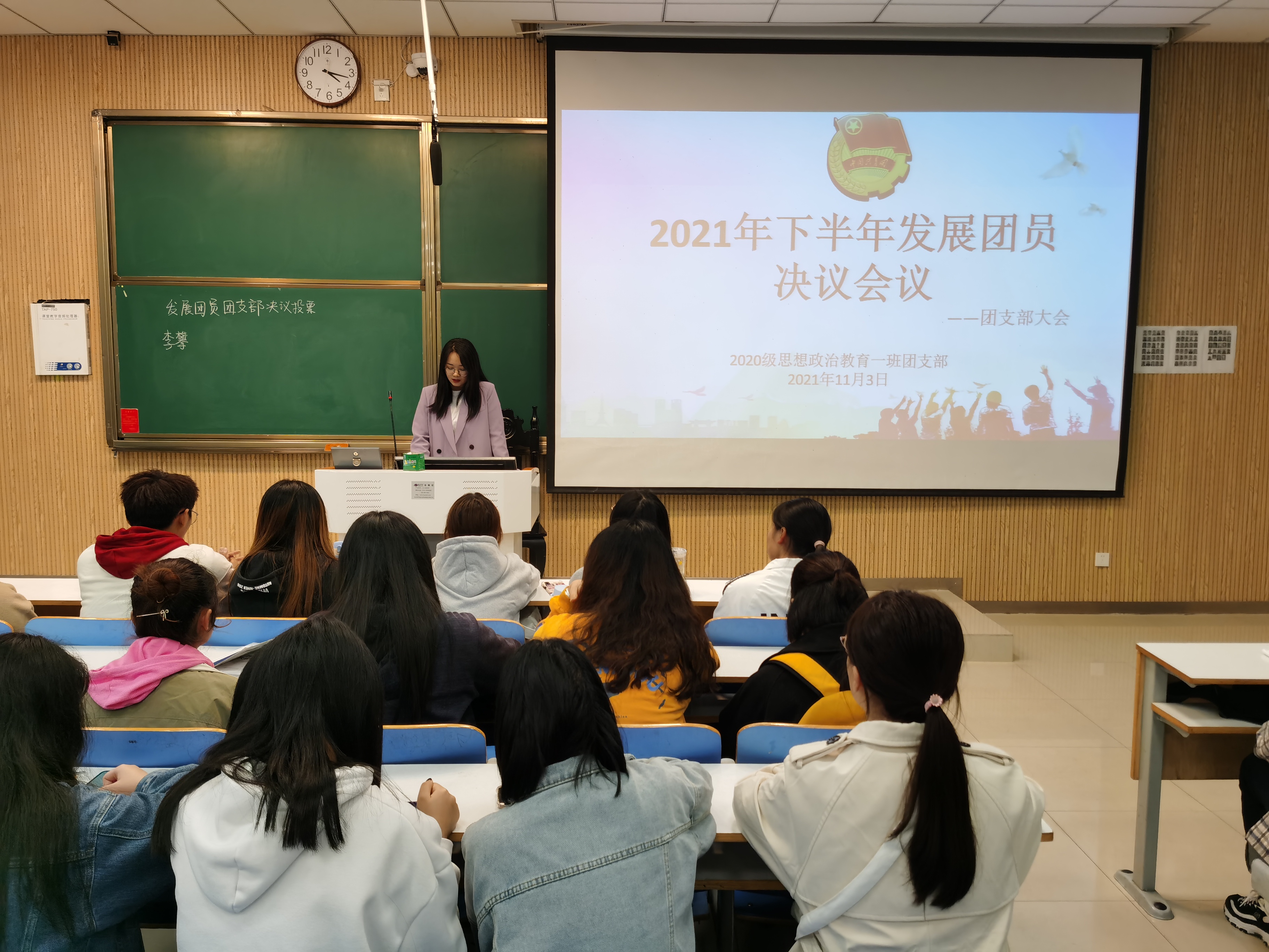 11月4日下午,pp电子官方网站 2020 级思想政治教育一班在社科楼515教室召开“2021年下半年发展团员决议”团支部大会。2020 级思想政治教育一班全体团员参加了本次大会,大会由团支书卢茜雨主持。