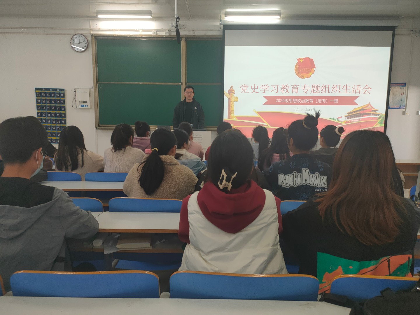 11月11日上午,pp电子官方网站2020级思想政治教育定向一班党史学习教育专题组织生活会在社科楼514教室顺利召开。辅导员曹栋及2020级思想政治教育定向一班全体学生共同参加本次会议。