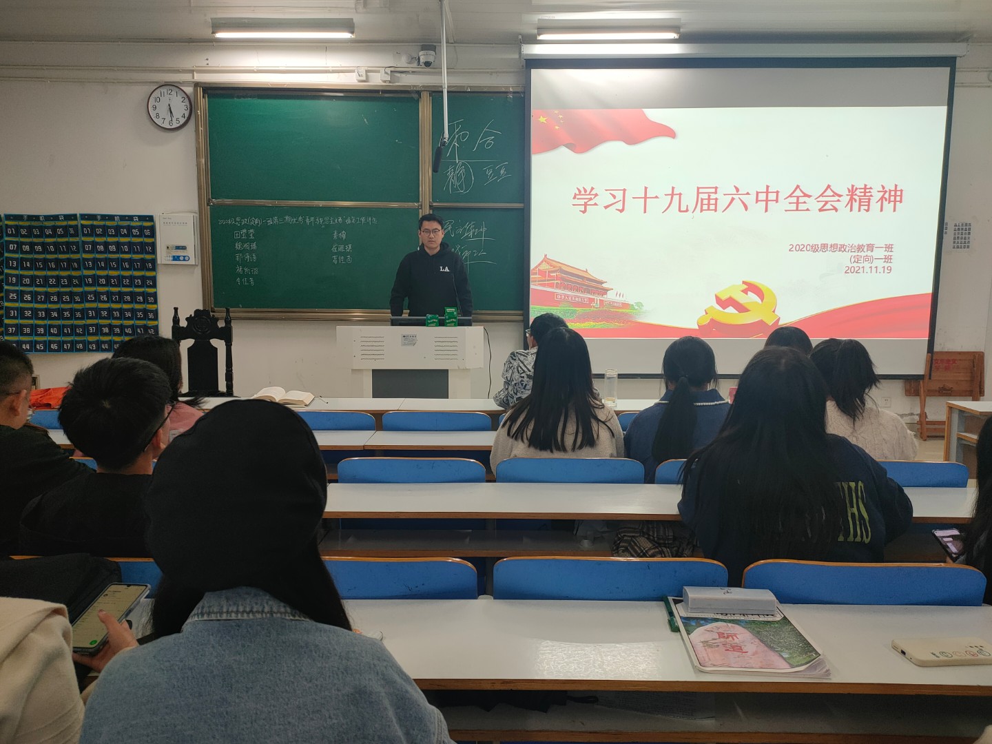 11月19日下午,pp电子官方网站2020级思想政治教育一班、定向一班在社科楼516教室开展“学习十九届六中全会精神”主题团课。pp电子官方网站2020级思想政治教育一班、定向一班全体成员参加本次团课。