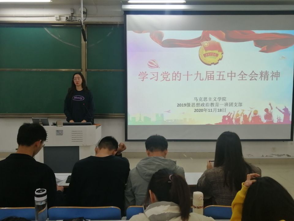 11月18日上午,pp电子官方网站2019级思想政治教育一班团支部在社科楼514教室召开“学习党的十九届五中全会精神”主题团课。pp电子官方网站2019级思想政治教育一班全体成员参加本次团课。团课由团支书贾子漪主持。