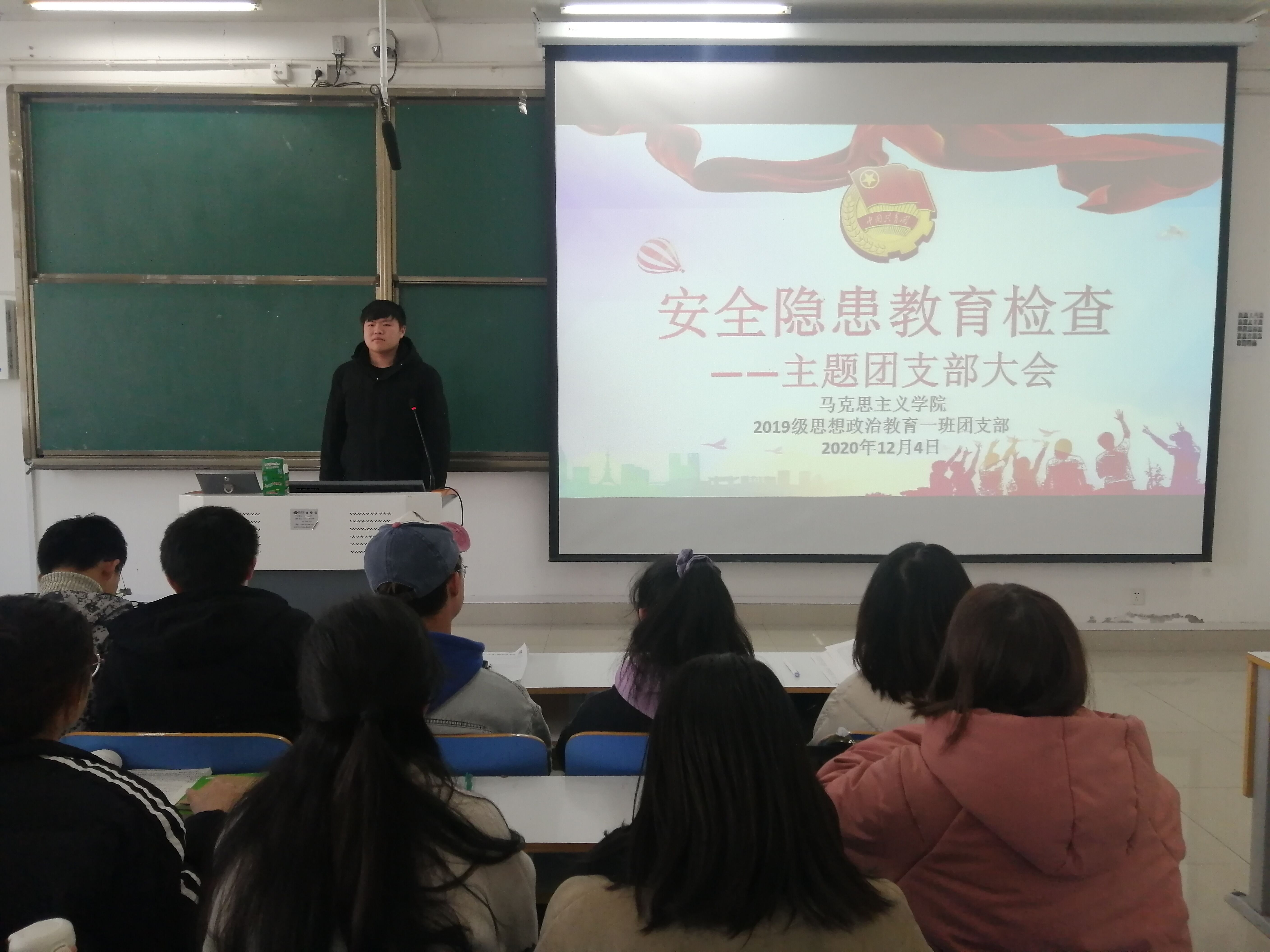 为进一步加强同学们的安全教育观念,提高同学们的避险能力。12月4日上午,pp电子官方网站2019级思想政治教育一班第一团支部在社科楼516教室召开“安全隐患教育”主题团支部大会。pp电子官方网站2019级思想政治教育一班全体成员参加本次会议,会议由副班长王民主持。