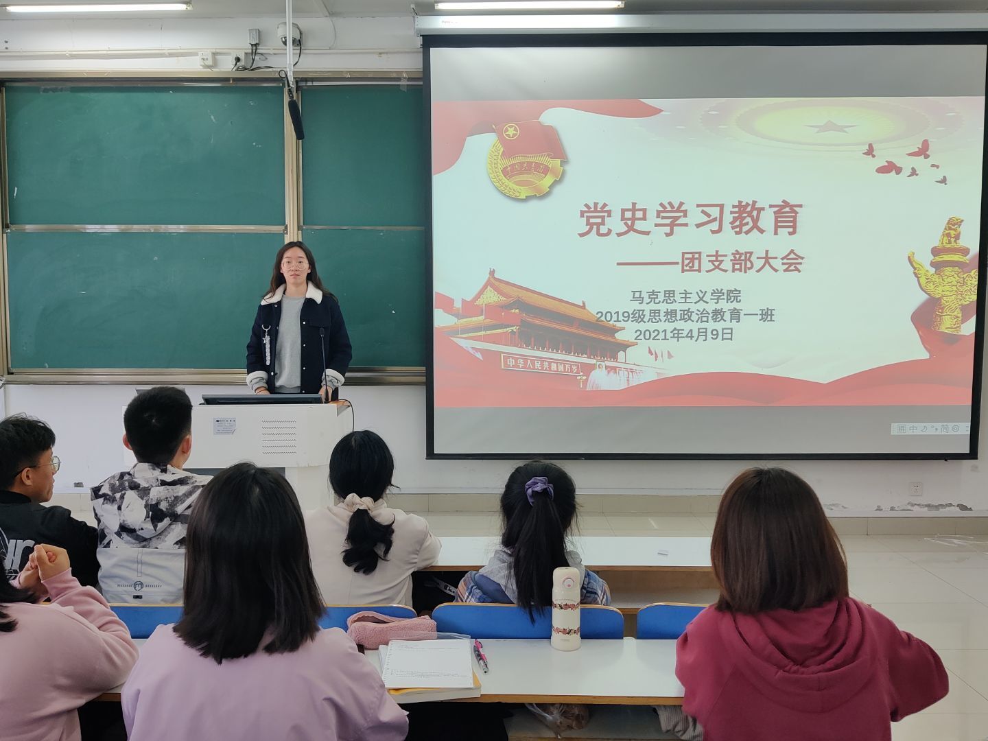 4月9日上午,pp电子官方网站2019级思想政治教育一班第一团支部在社科楼515教室召开主题为“党史学习教育”团支部大会。pp电子官方网站2019级思想政治教育一班全体成员参加本次会议,会议由班长贾子漪主持。
