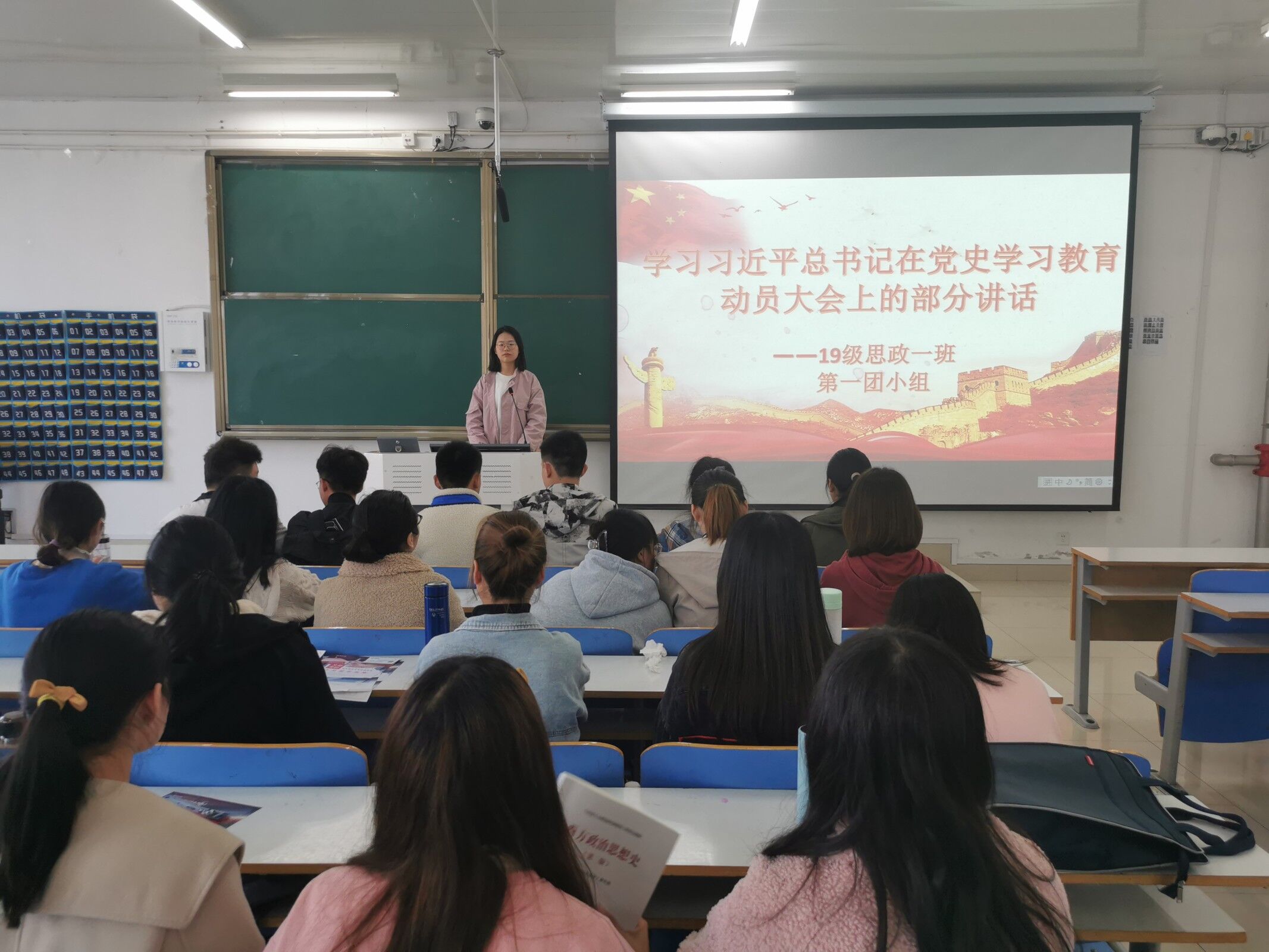 会议伊始,团小组组长刘勐向同学们介绍了党史学习教育的重要性以及主要内容。接着,她通过播放视频的方式,带领同学们重温习近平总书记关于党史学习教育的重要讲话。最后,刘勐带领大家一起合唱《没有共产党就没有新中国》。会议在同学们的掌声中落下帷幕。