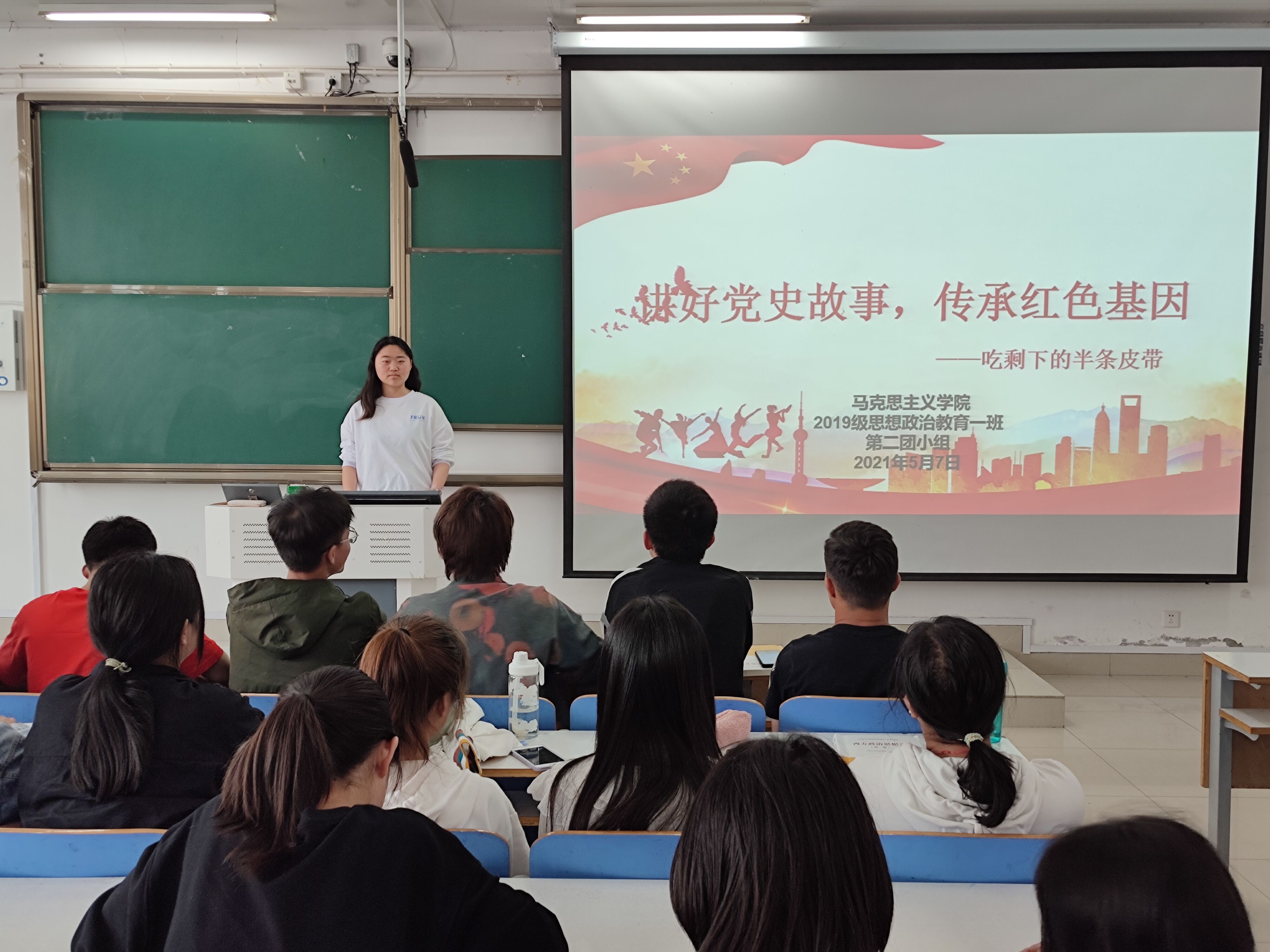 5月7日上午,pp电子官方网站思想政治教育一班第二团小组在社科楼516教室开展了以“讲好党史故事,传承红色基因——吃剩下的半条皮带”为主题的团小组会议。pp电子官方网站2019级思想政治教育第一团支部第二团小组全体成员参加本次会议。会议由第二团小组组长程子硕主持。