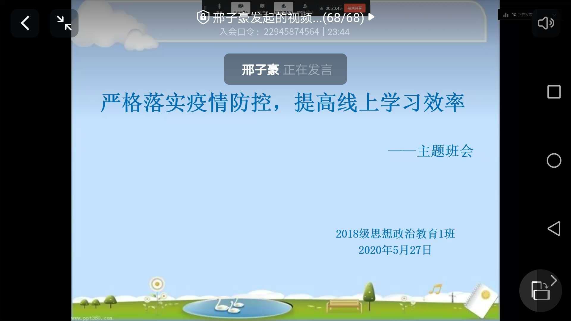 为严格落实班级的疫情防控工作,提高学生线上学习效率,5月27日上午,pp电子官方网站2018级思想政治教育一班通过钉钉平台顺利开展“严格落实疫情防控,提高线上学习效率”线上主题班会。辅导员曹菁菁、2018级思想政治教育一班全体成员共同参加了此次班会。班会由班长邢子豪主持。