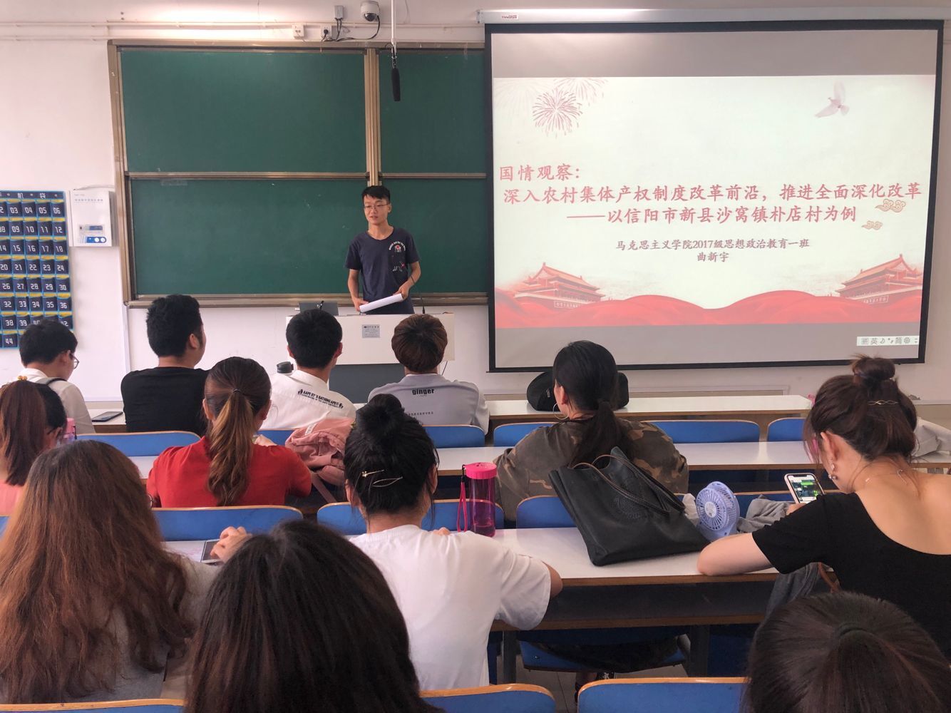 首先,谢文静介绍了本次团日活动的主题是思想引领行动,立足社会调研。接着曲新宇以信阳市新县沙窝镇补店村为例,从深入农村集体产权制度改革前沿,推进全面深化改革角度出发系统阐述了他的调研过程并分享了他的调研思路。其中曲新宇还特别谈到在新时代背景下进行调研内容要切合时代要求,符合时代精神,理论内容在一定程度上要体现出专业特色。最后,同学们之间互相交流了各自的实践调研和理论形成方法。