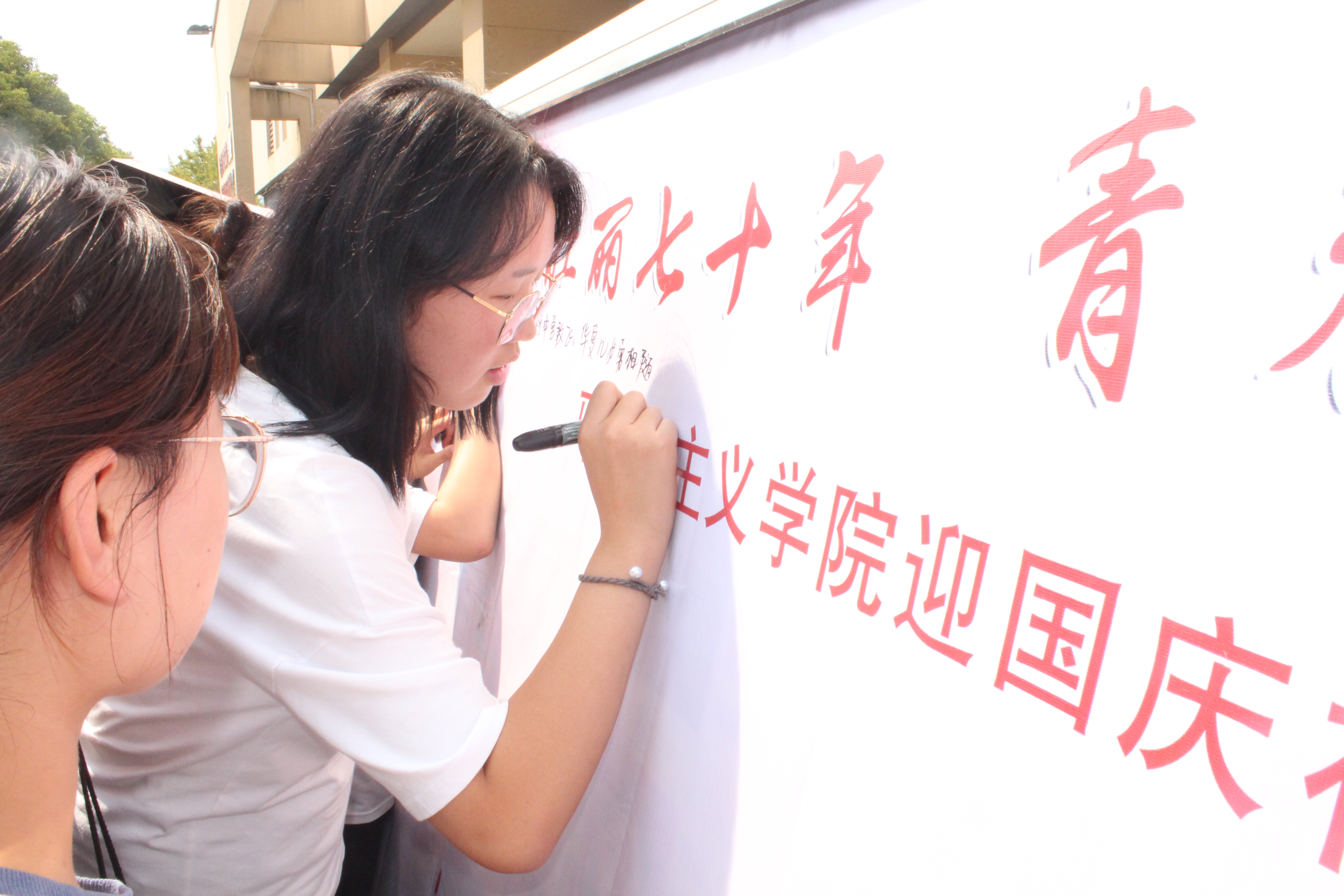 首先,靳雨露带领同学们共同观看《我为我的祖国感到骄傲》和《新中国七十周年历史成就》两个视频,深入体会新中国成立以后祖国的巨大变化,引导同学们学习并弘扬爱国精神。她提出,我们的青春应以国旗的颜色作为底色,应以中华民族的历史责任作为方向,把个人之小我融入到祖国之大我中,真正做到与祖国同呼吸、共命运、齐奋进。随后,靳雨露组织同学们在社科楼下合唱红色经典歌曲《我和我的祖国》,表达对祖国的热爱与赞美。最后,同学们有序地在展板上签上自己的名字和对祖国的美好祝愿。