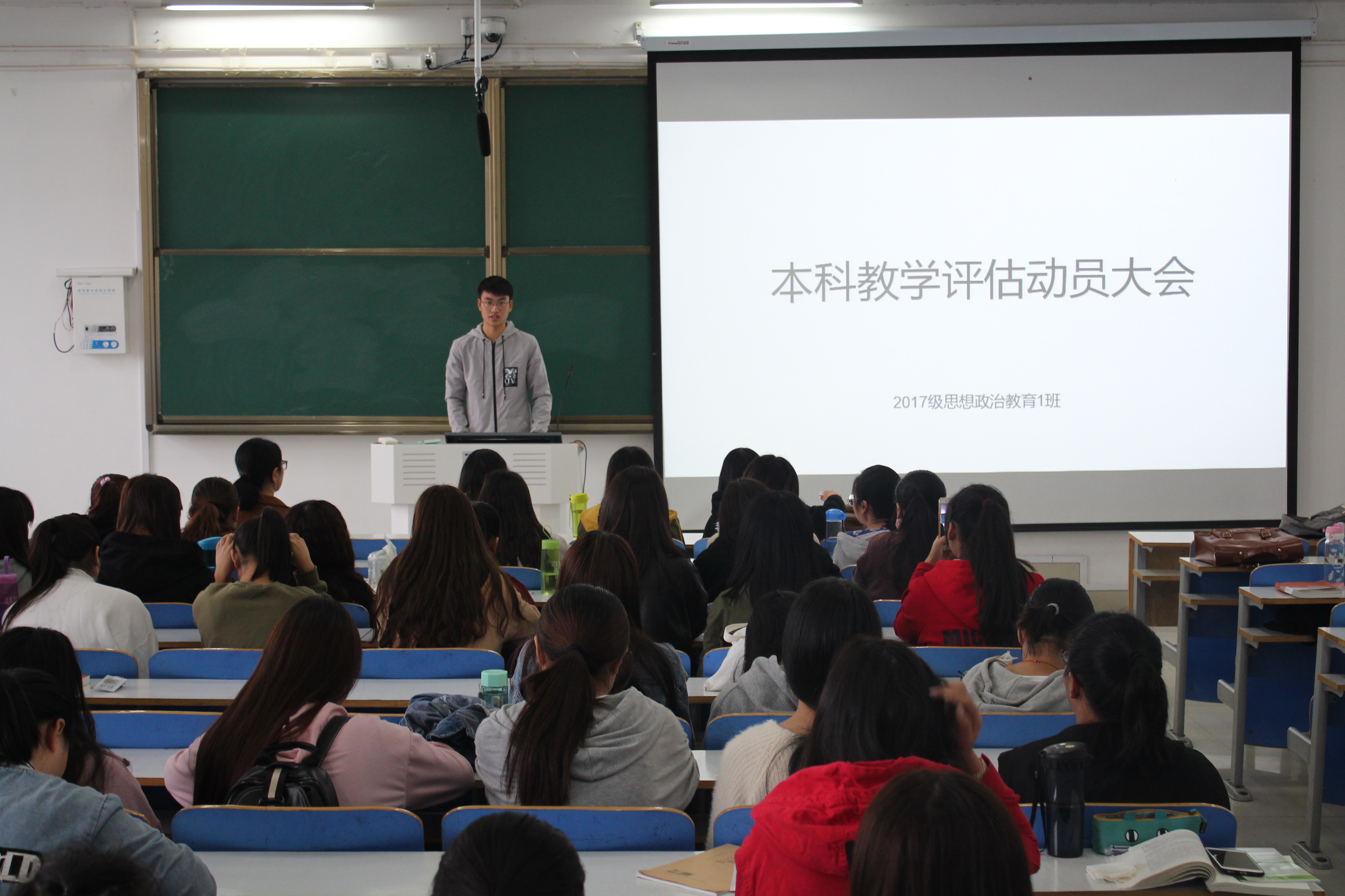 为迎接我校本科教学工作审核评估工作,增强学生的在校自觉性,10月19日上午,2017级思想政治教育一班在社科楼514教室召开本科教学评估动员大会主题班会。此次班会由2017级思想政治教育一班学生参与,班长邹创主持。