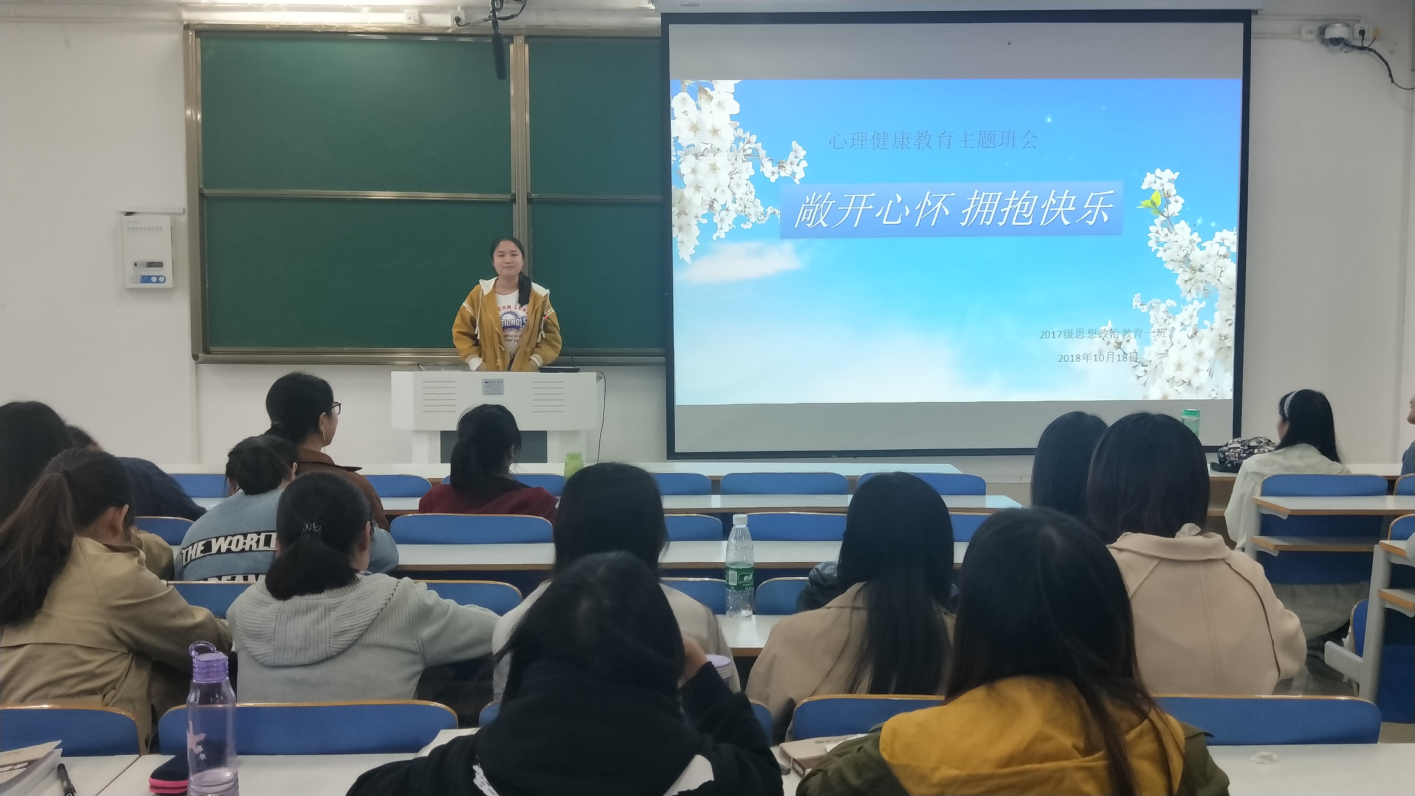 为提高我班学生心理调节能力,保持积极向上的心态,10月22日下午,pp电子官方网站2017级思想政治教育一班全体学生在社科楼514教室举办了“敞开心扉,拥抱快乐”主题班会,本次班会由团支书谢文静主持。