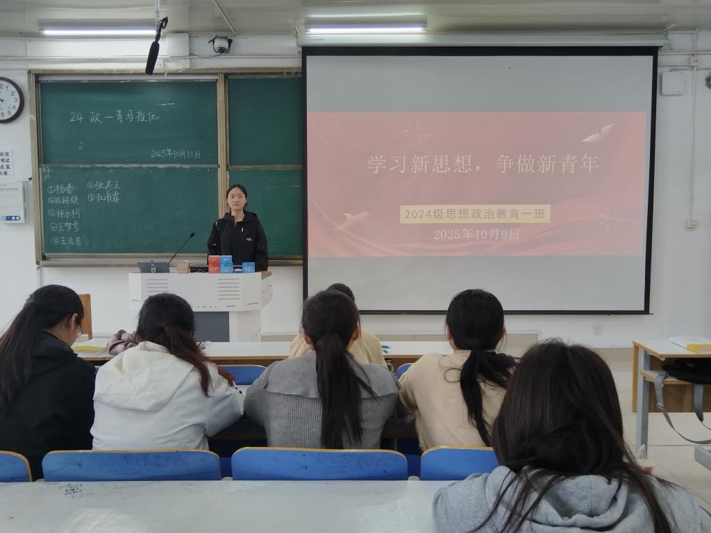 为激励我班同学深入学习和贯彻习近平新时代中国特色社会主义思想,将党的智慧结晶同个人发展实际相结合,以实际行动实现人生理想和民族复兴,10月9日上午,pp电子官方网站思想政治教育一班于社科楼515教室开展“学习新思想,争做新青年”主题团课。本次团课由团支书李冉主持,一班全体同学参加。