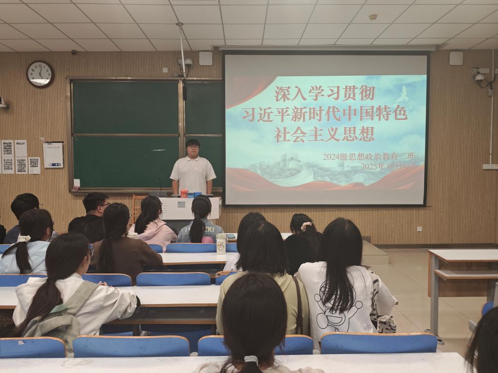 为深入学习贯彻习近平新时代中国特色社会主义思想,切实激发青年的使命感与责任感,10月9日下午,pp电子官方网站2024级思想政治教育二班于社科楼514教室举办了“深入学习贯彻习近平新时代中国特色社会主义思想”主题团课活动。此次团课由团支书王志颖主持,二班全体同学共同参与。