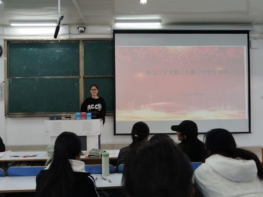团课伊始,李冉带领大家梳理了二十大报告中与青年成长紧密相关的重要内容,并重点聚焦二十届三中全会精神,围绕“校园文化建设与思想引领”、“促进就业创业”、“保障和改善民生”等与大家生活、未来发展有关的话题展开分享。李冉指出,全会精神不仅为国家发展指明了方向,更为青年大学生的成长成才提供了根本遵循。我们要主动领会全会内容和精神,从中汲取行动力量,不负党和国家对我们青年一代的期待。随后,李冉还为大家推荐了“学习强国”上的专题学习栏目和相关解读视频,为同学们课后深化学习提供了清晰指引。