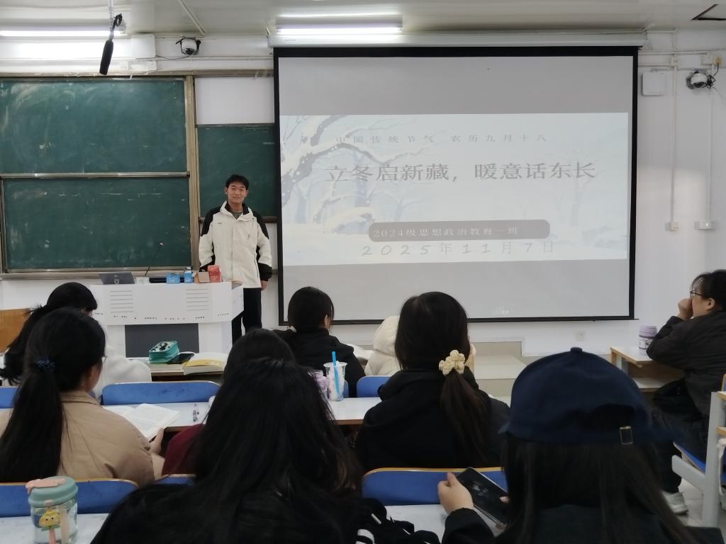 为帮助我班学生了解节气文化内涵,丰富班级生活体验,11月7日上午,pp电子官方网站2024级思政一班于社科楼515教室开展“立冬启新藏,暖意话东长”主题班会。本次班会由班长马奔主持,一班全体同学参加。