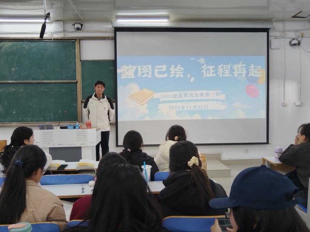 为明确班级发展目标,激发同学们建设优秀班集体的奋进意识,11月25日下午,pp电子官方网站2024级思政一班开展“蓝图已绘,征程再起”主题班会。本次班会由班长马奔主持,一班全体同学参加。