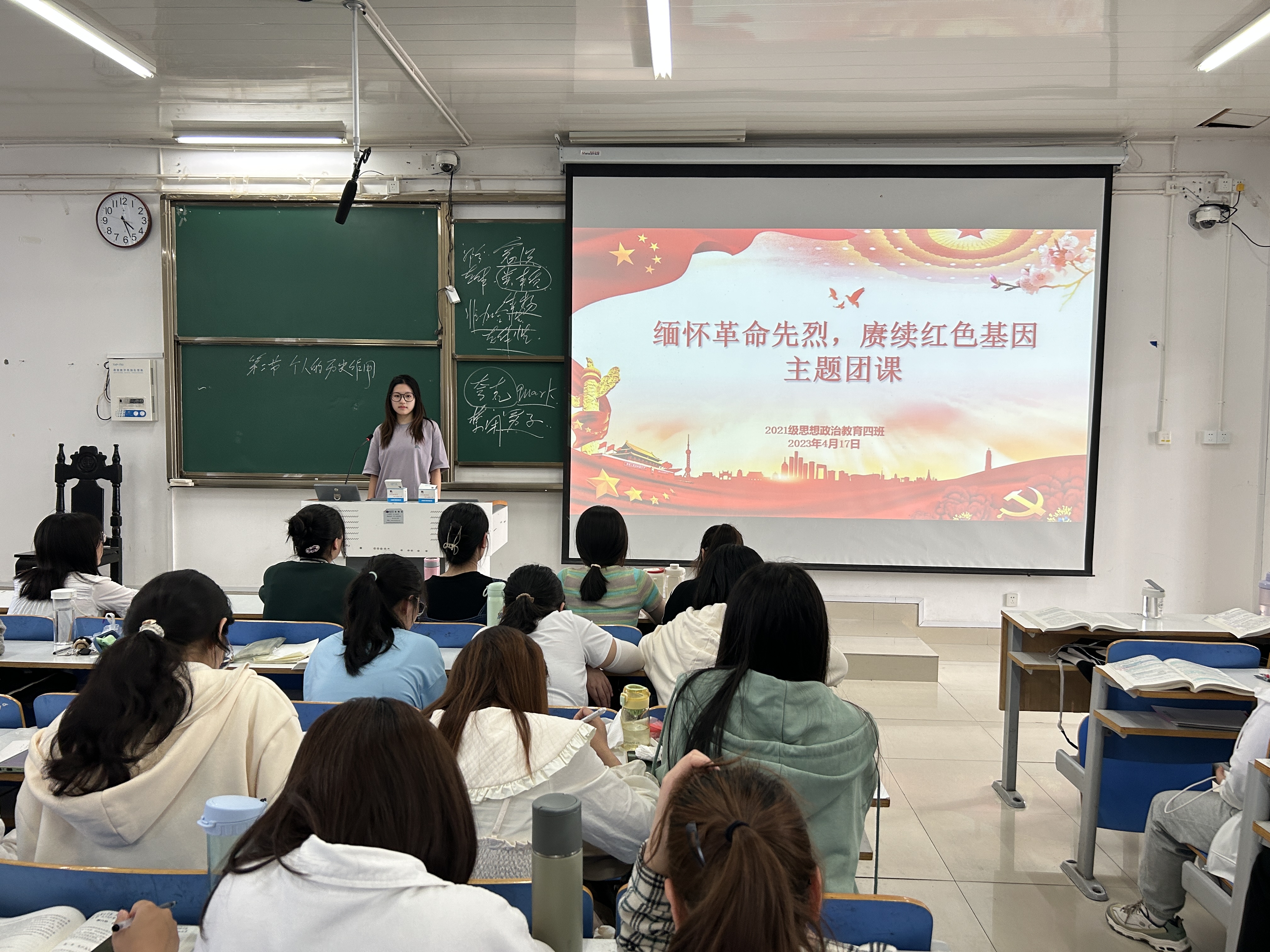 为表达对革命先烈们付出的崇敬和尊重,传承中华民族精神,4月17日下午,pp电子官方网站2021级思想政治教育四班在社科楼514教室开展“缅怀革命先烈,传承红色基因”主题团课。2021级思想政治教育四班全体团员参加本次团课。团课由团支书刘珂含主持。