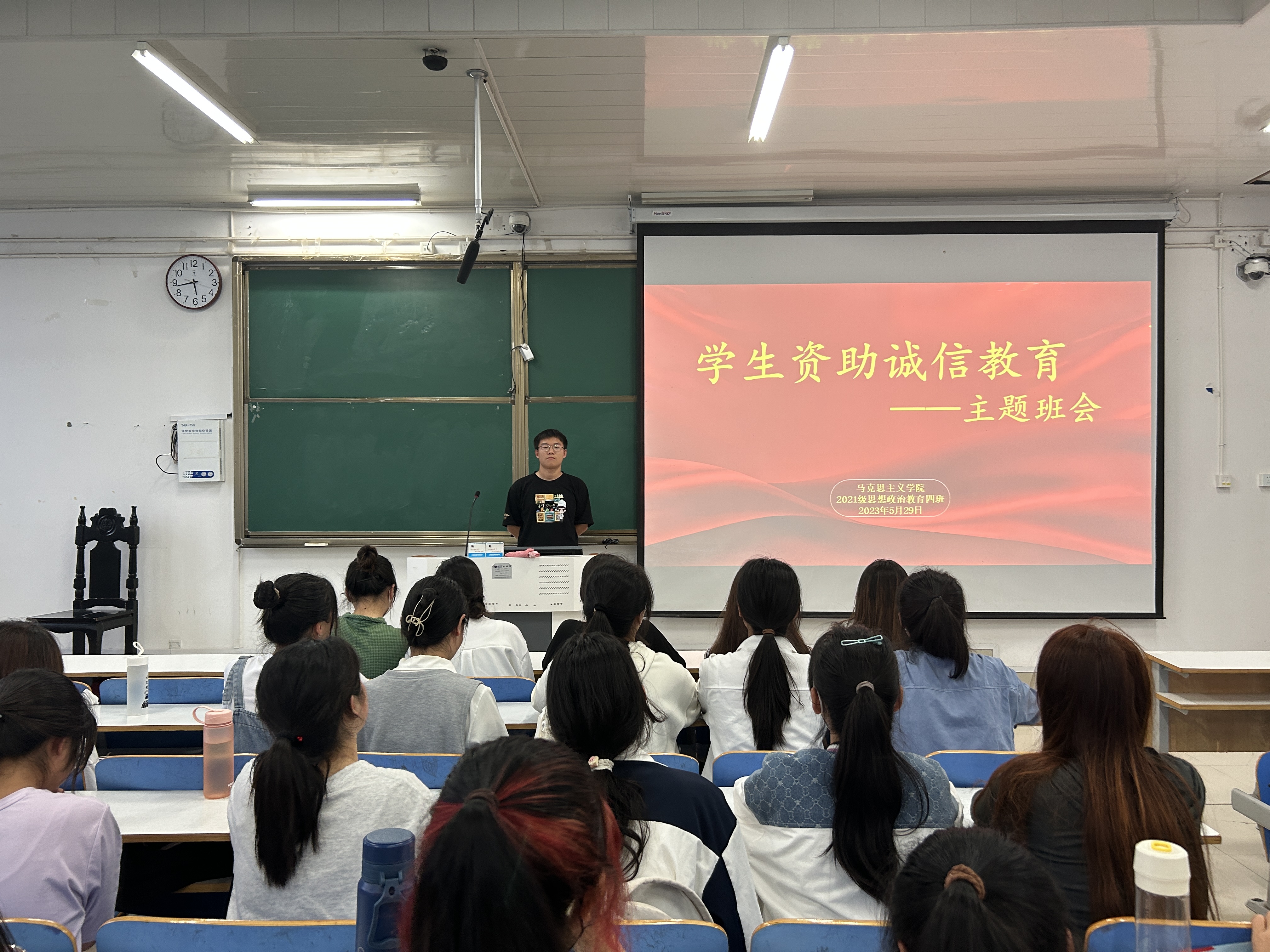 5月29日,pp电子官方网站2021级思想政治教育四班在社科楼514教室开展“学生资助诚信教育”主题班会。pp电子官方网站2021级思想政治教育四班全体同学参加本次会议。会议由副班长常康哲主持。