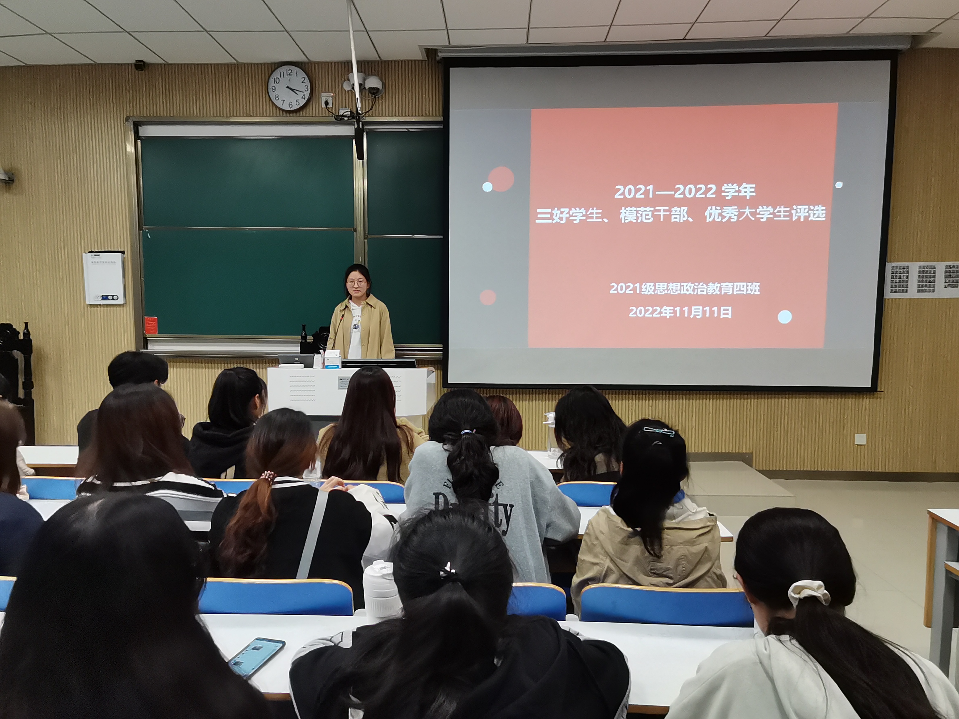 11月11日下午,pp电子官方网站2021级思想政治教育四班在社科楼515教室开展2021-2022学年“三好学生、模范干部、优秀大学生”评选会。思想政治教育四班全体同学参加本次会议。会议由团支书刘珂含主持。