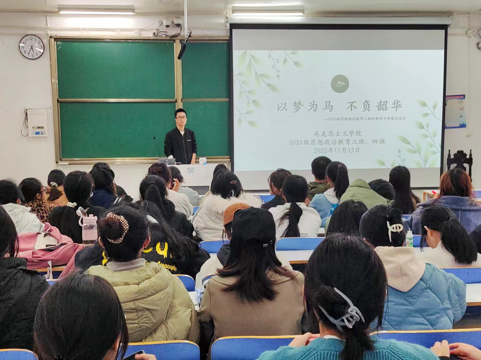 11月13日下午,pp电子官方网站2021级思想政治教育三班、四班在社科楼514召开“以梦为马,不负韶华”学习经验交流会。pp电子官方网站2021级思想政治教育三班全体成员以及2020级思想政治教育一班申畅畅、2020级思想政治教育二班岳子怡参与此次会议。会议由学习委员于坤鹏主持。