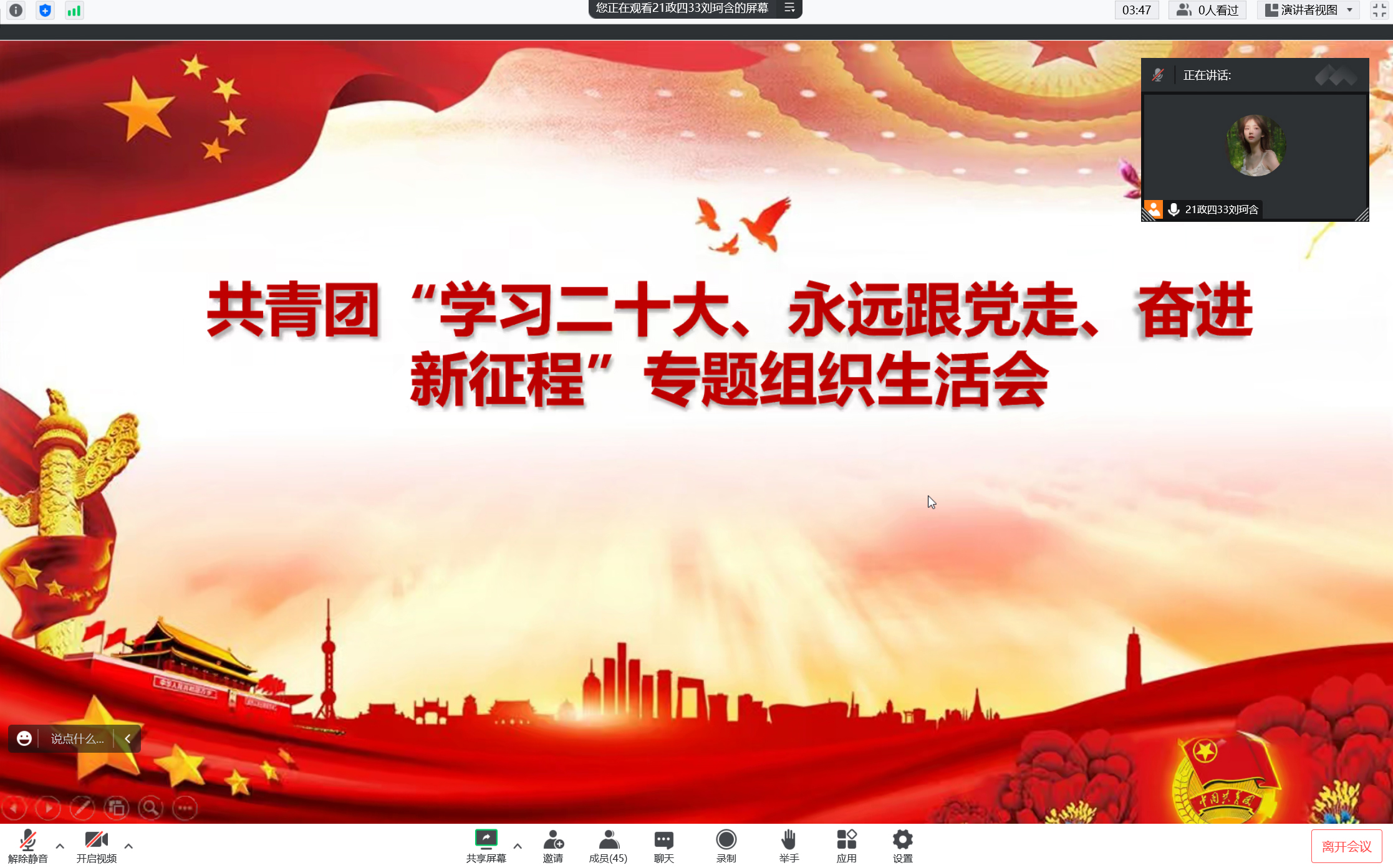 本次大会由合唱团歌、团支部汇报工作、团支部委员和团小组组长进行发言等三部分组成。会议伊始,全体成员打开麦克风,合唱《光荣啊!中国共青团》团歌。接着,团支书刘珂含汇报工作,并进行自我批评和自我反思。随后,团支部委员和团小组组长王月、刘畅等作为团员代表发言,并对这段时间的学习和生活进行自我批评和反思。最后,团支书刘珂含进行点评,并对本次组织生活会进行总结。她就学习二十大方面对同学们提出以下几点要求:二十大报告思想深邃,内涵丰富,要加强学习,深学细研,把党的二十大精神落细落实,深刻领会蕴含其中的精髓要义。