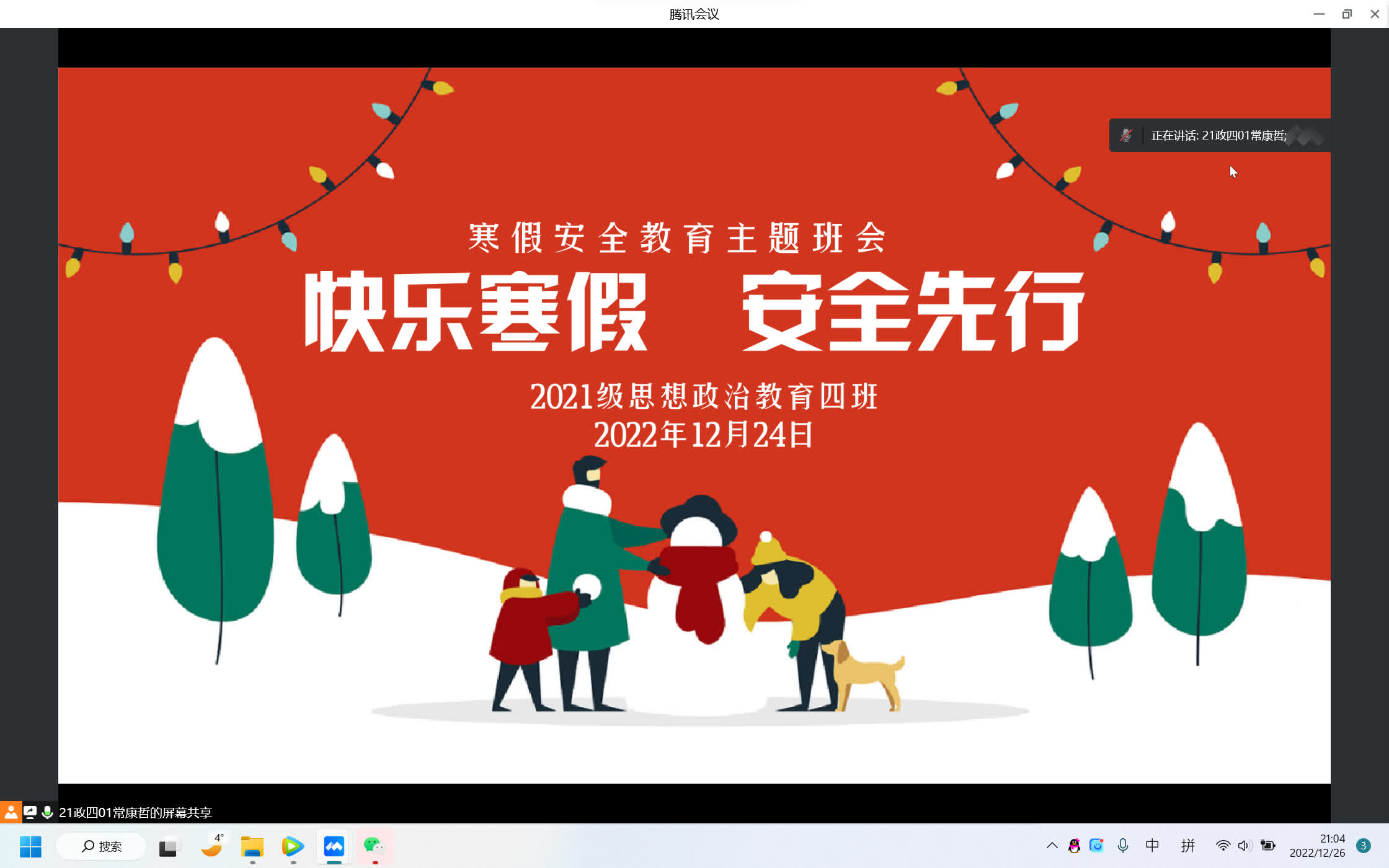 12月24日下午,pp电子官方网站2021级思想政治教育四班线上开展“快乐寒假,安全先行”安全教育主题班会。pp电子官方网站2021级思想政治教育四班全体同学参加本次会议。会议由副班长常康哲主持。
