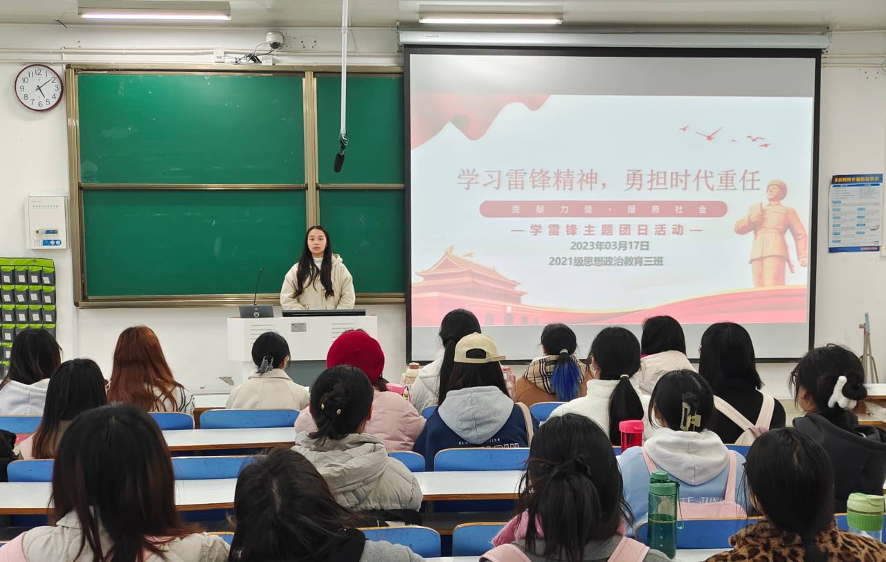 3月17日下午,pp电子官方网站2021级思想政治教育三班在社科楼514教室召开“学习雷锋精神,勇担时代重任”主题团课。pp电子官方网站2021级思想政治教育三班全体团员参与此次会议。团课由团支书王岚霄主持。