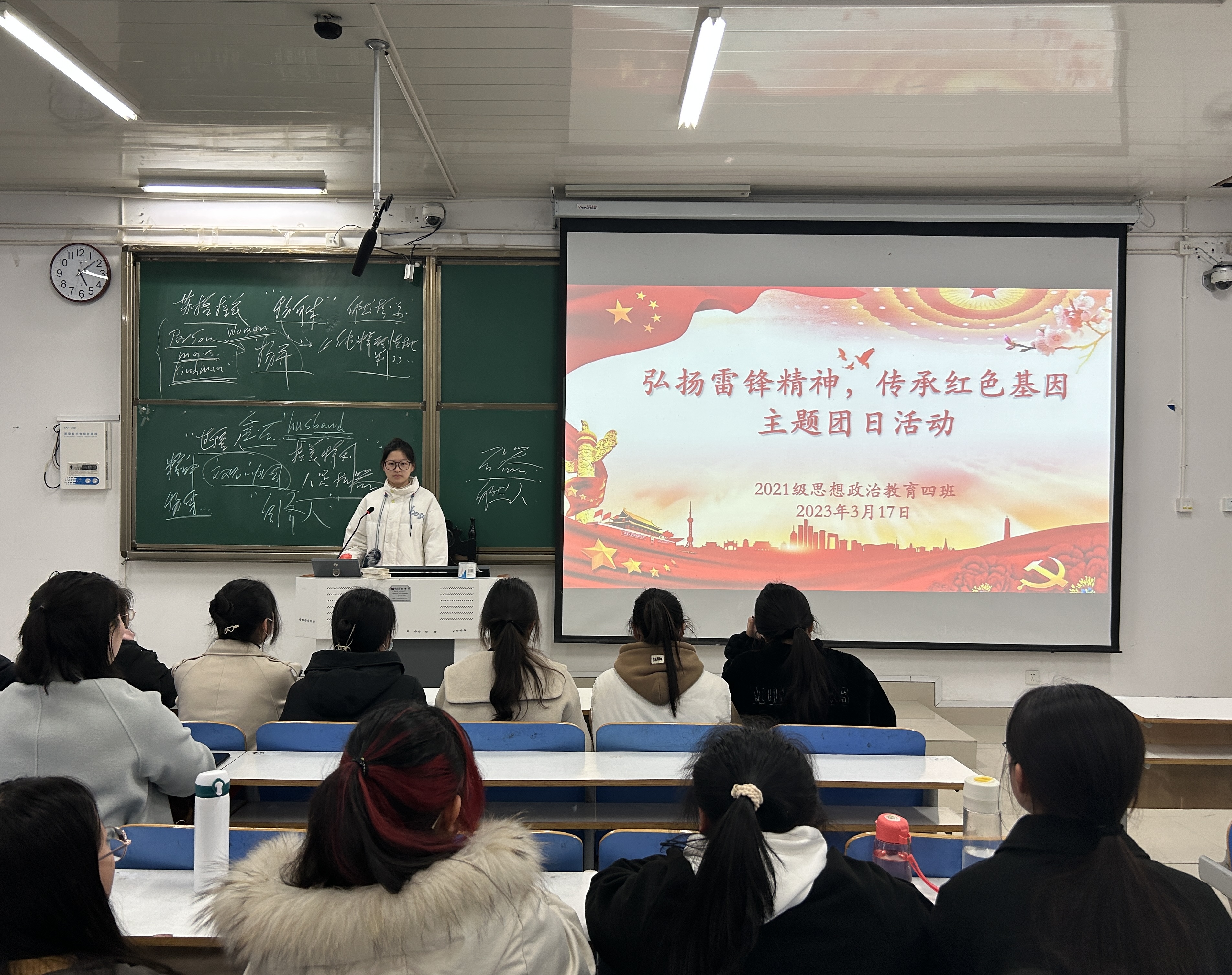 为大力弘扬雷锋精神,传承雷锋艰苦朴素的优良作风,3月17日下午,pp电子官方网站2021级思想政治教育四班在社科楼514教室开展“弘扬雷锋精神,传承红色基因”主题团日活动。2021级思想政治教育四班全体成员共同参加本次活动,活动由团支书刘珂含主持。