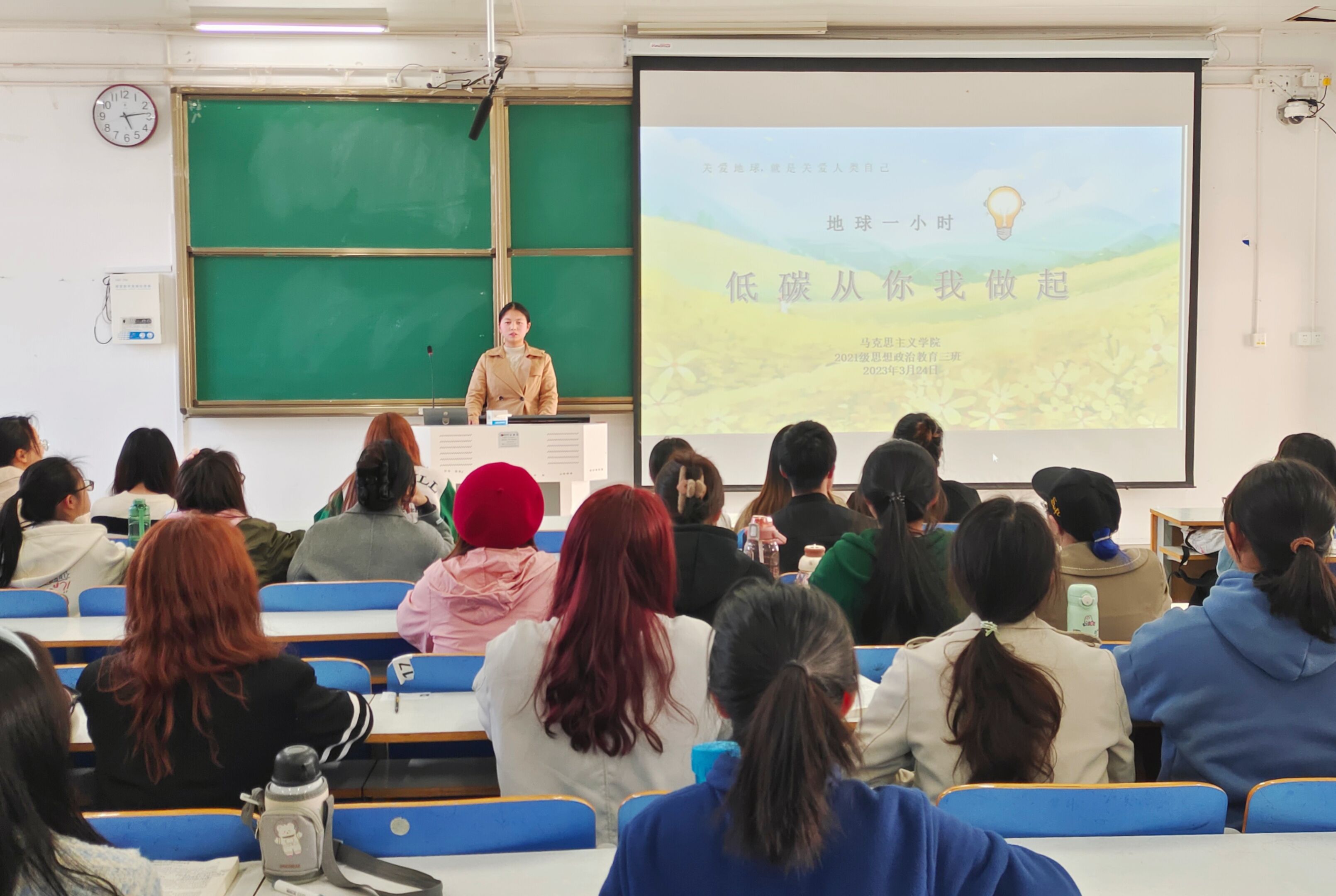 3月24日下午,pp电子官方网站2021级思想政治教育三班在社科楼514教室召开“低碳从你我做起”主题班会。pp电子官方网站2021级思想政治教育三班全体成员参与此次会议。班会由副班长易从漫主持。