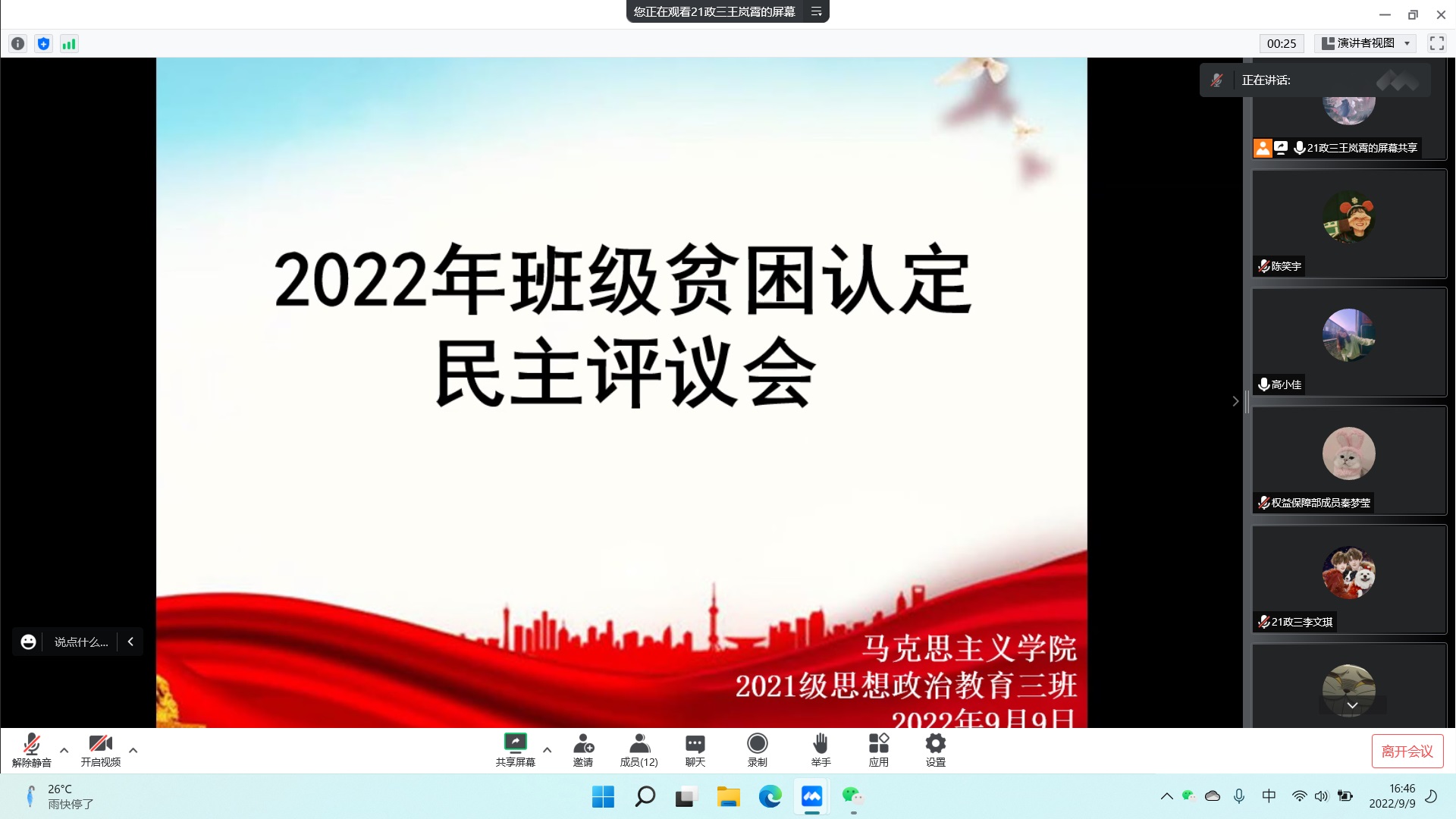 9月9日下午,pp电子官方网站2021级思想政治教育三班召开线上2022年班级贫困认定民主评议会。2021级思想政治教育三班贫困认定委员团全体成员以及权益保障部秦梦莹、宣传委员陈笑宇参与此次会议。会议由团支书王岚霄主持。