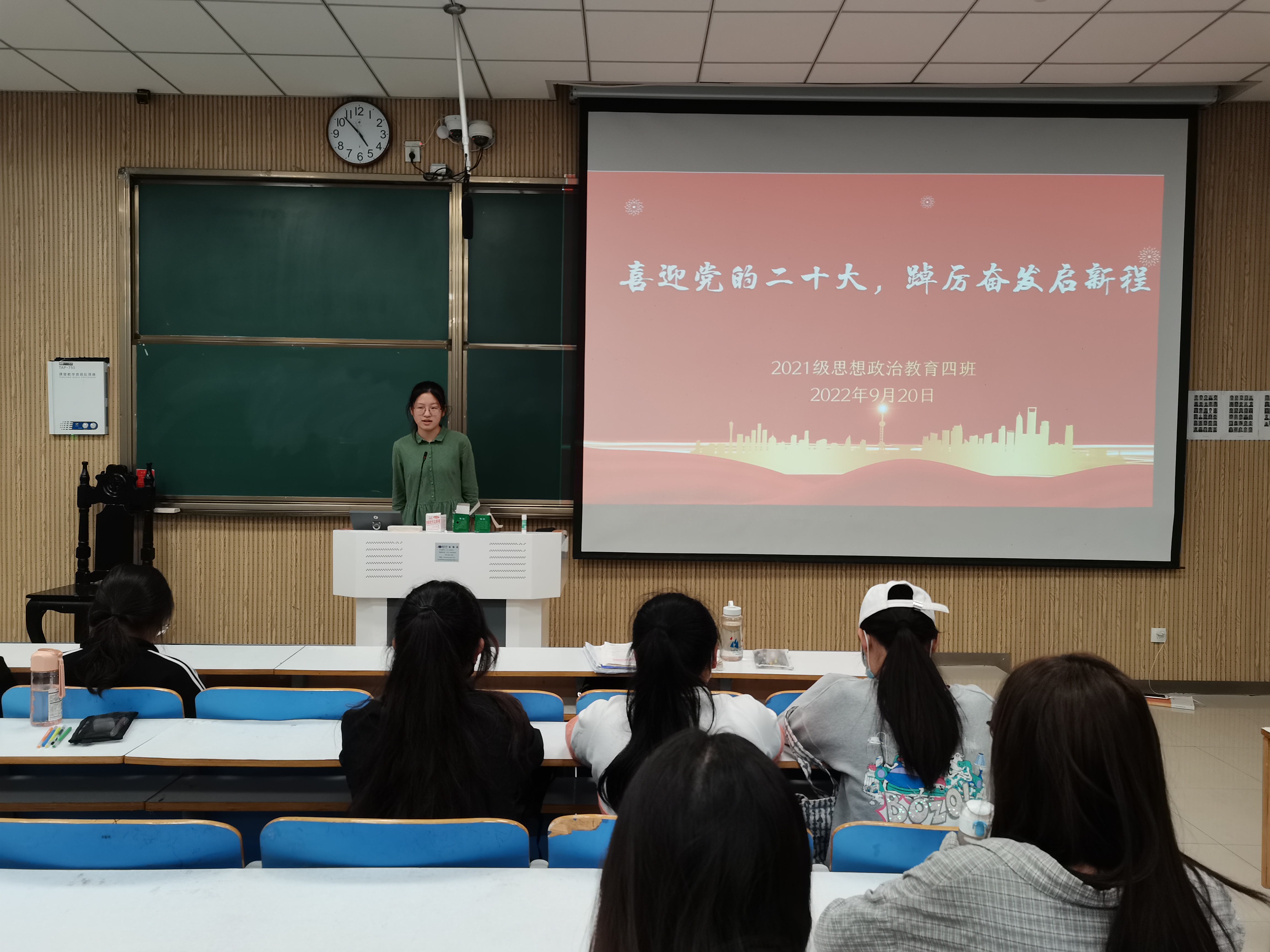 9月20日下午,pp电子官方网站2021级思想政治教育四班在社科楼516教室召开“喜迎党的二十大,踔厉奋发启新程”主题团课。2021级思想政治教育四班全体同学参加本次团课。团课由团支书刘珂含主持。