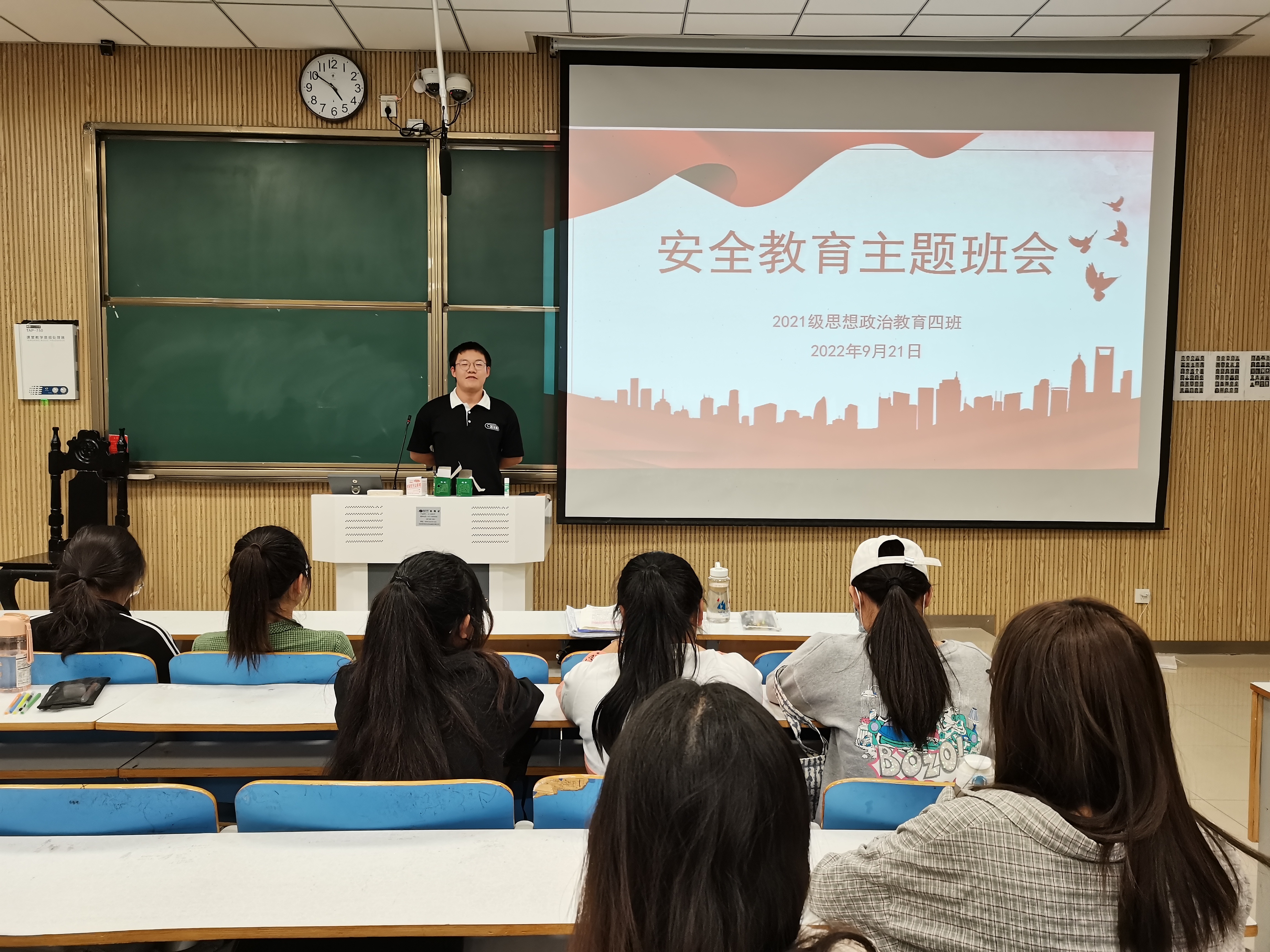 9月21日下午,pp电子官方网站2021级思想政治教育四班在社科楼515教室开展安全教育主题班会。2021级思想政治教育四班全体同学共同参会。班会由副班长常康哲主