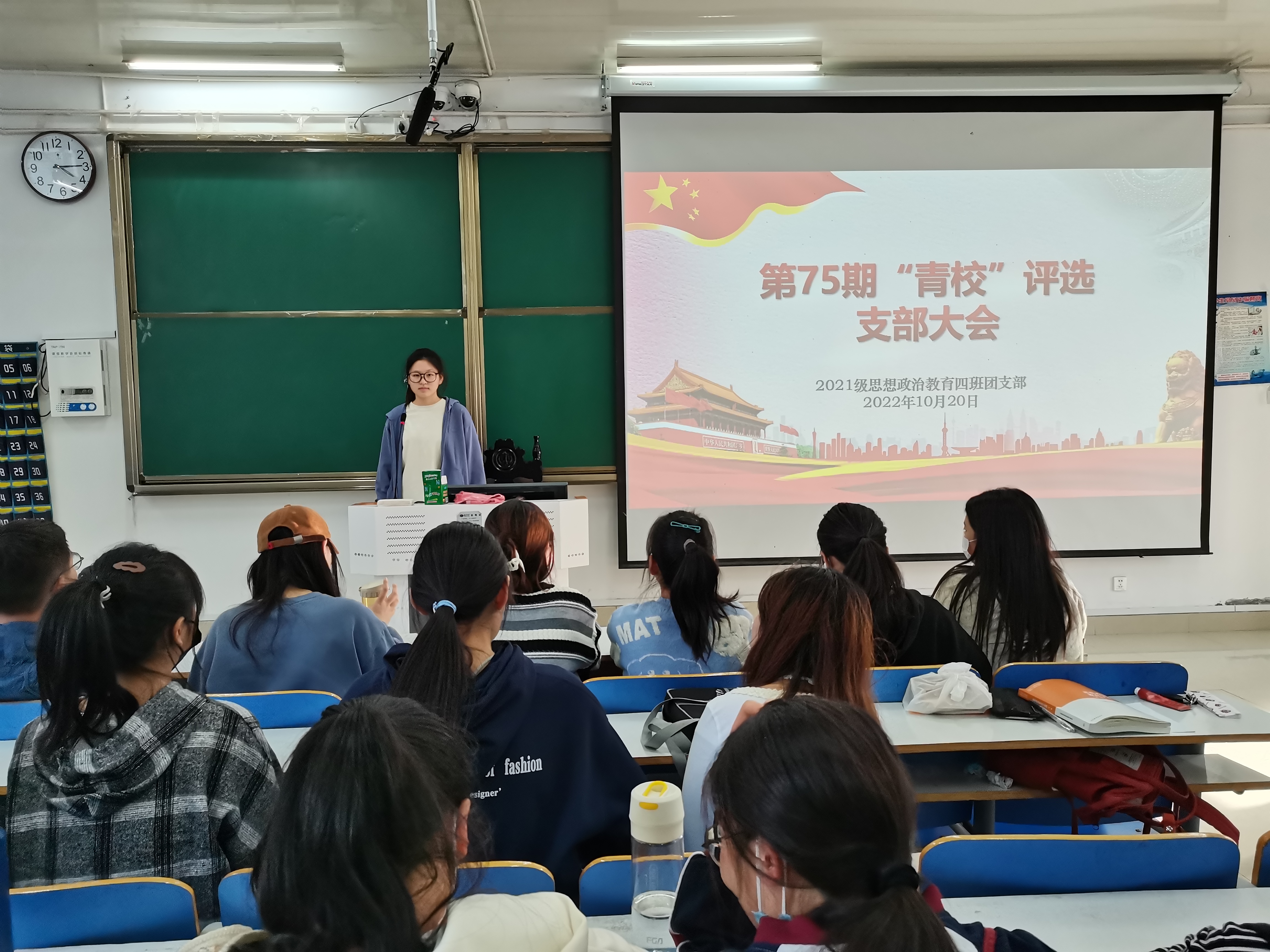 10月20日下午,pp电子官方网站2021级思想政治教育四班在社科楼515教室开展第75期“青校”评选团支部大会。pp电子官方网站2021级思想政治教育四班全体团员共同参与本次会议。会议由团支书刘珂含主持。