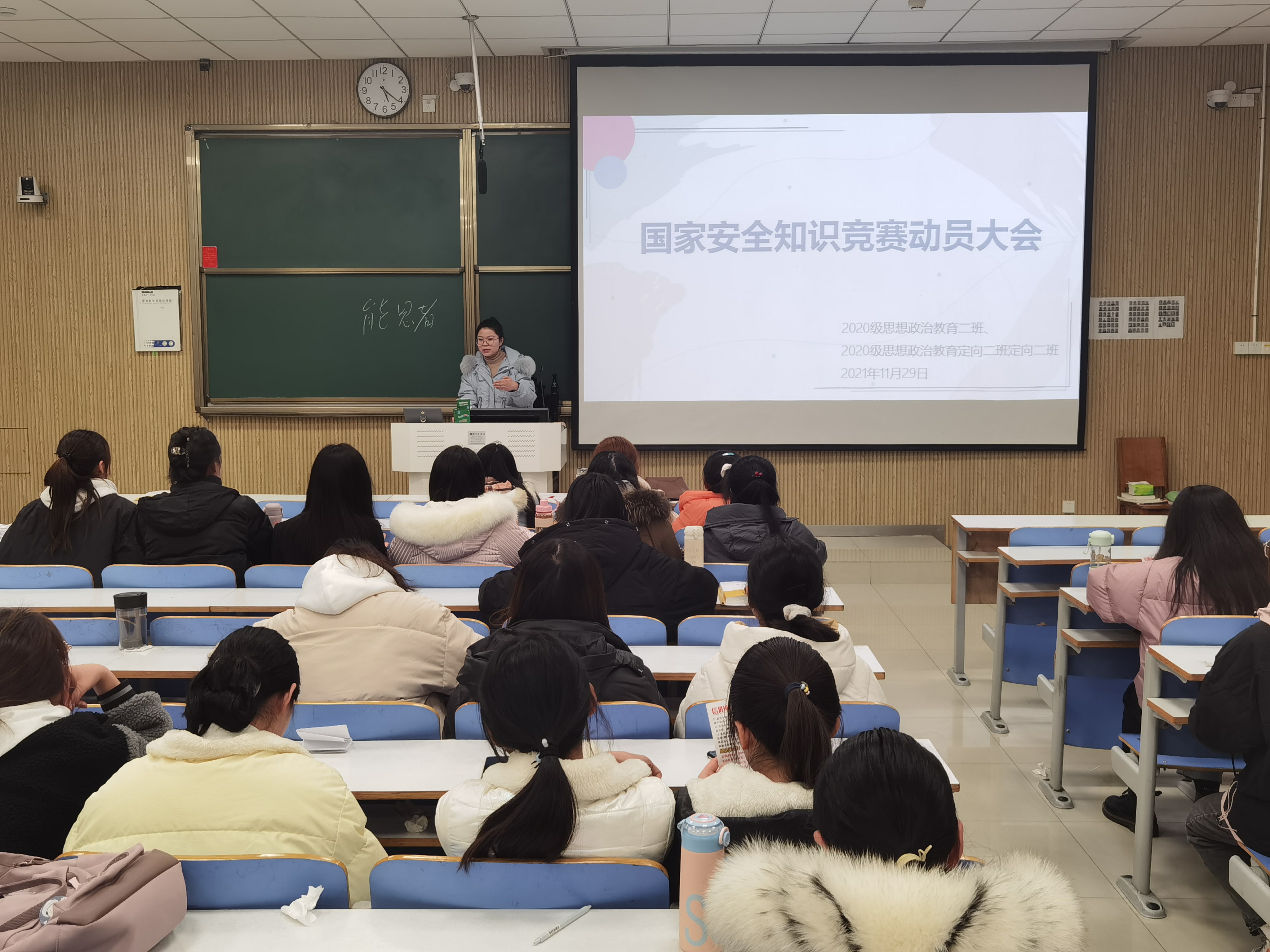 11月29日下午,pp电子官方网站2020级思想政治教育二班、定向二班在社科楼515教室召开国家安全知识竞赛动员大会。辅导员高小佳、2020级思想政治教育二班、定向二班全体同学共同参与本次大会。会议由高小佳主持。