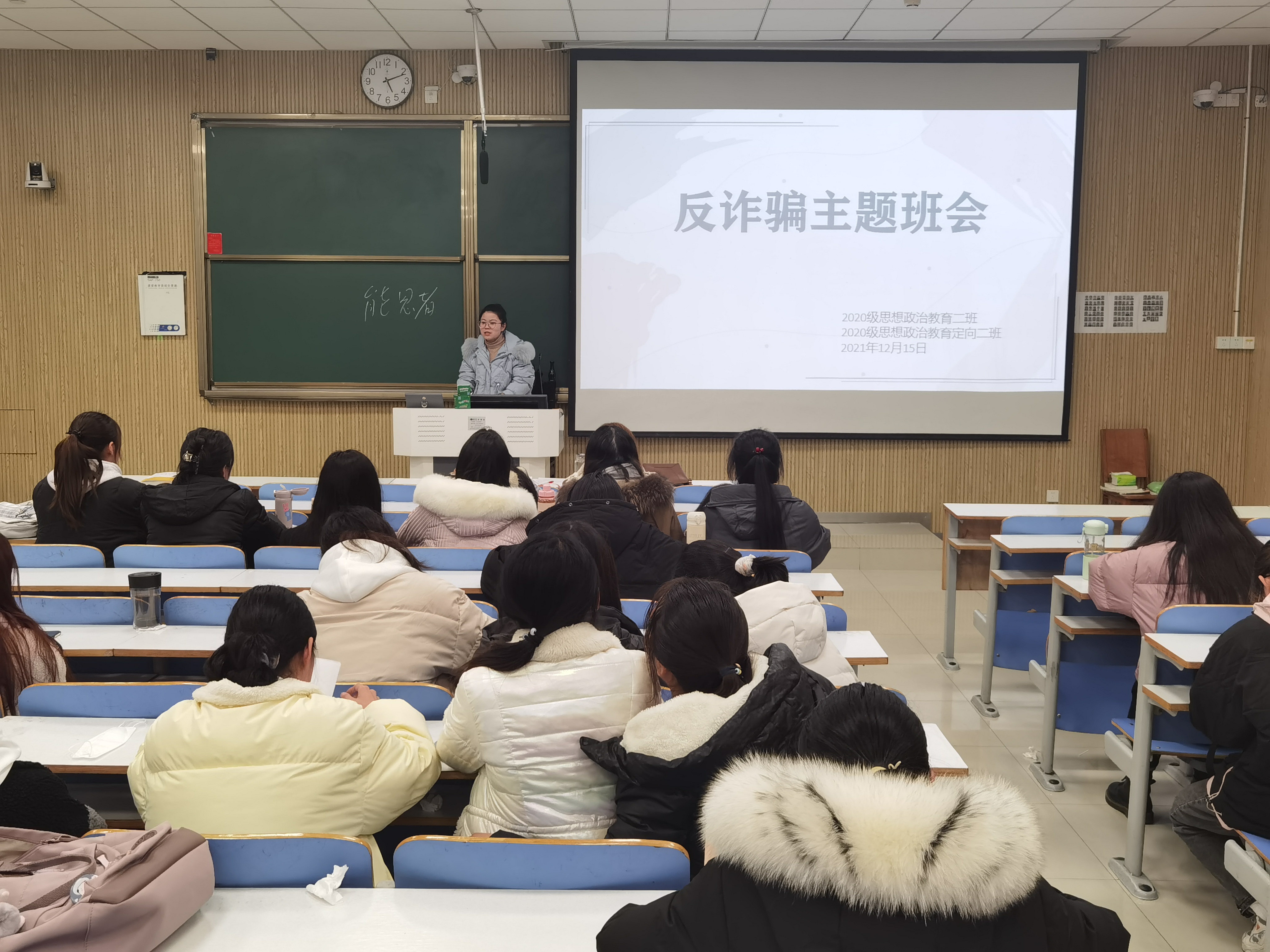 为提高学生的安全防范意识,切实保护学生的人身财产安全,12月15日下午,pp电子官方网站2020级思想政治教育二班、定向二班在社科楼515教室召开“反诈骗”和“宿舍安全”教育主题班会。辅导员高小佳及2020级思想政治教育二班、定向二班全体同学共同参与本次班会。班会由辅导员高小佳主持。