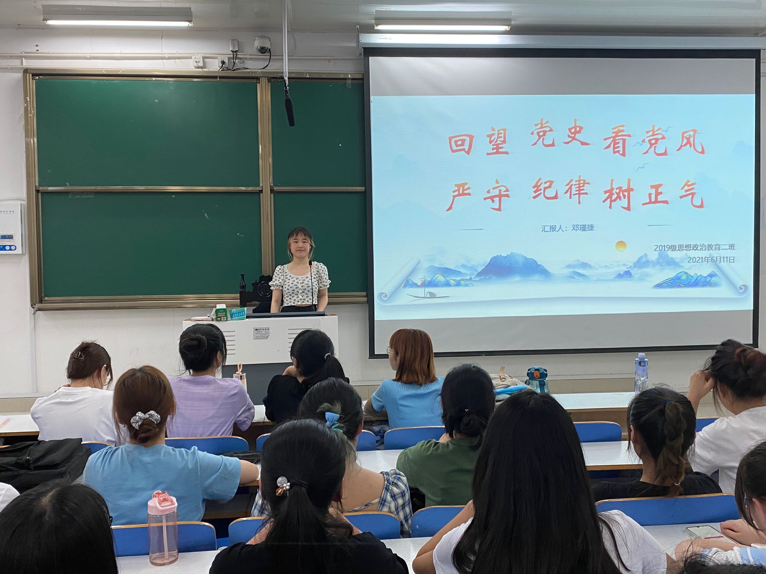 每一次历史回眸,都是一次精神洗礼;每一次党性教育,都是一次自我革命。6月11日上午,pp电子官网2019级思想政治教育二班于社科楼516教室召开“回望党史看党风 严守纪律树正气”党史教育主题团课。2019级思想政治教育二班全体成员共同参会。会议由文体委员邓瑾捷主持。