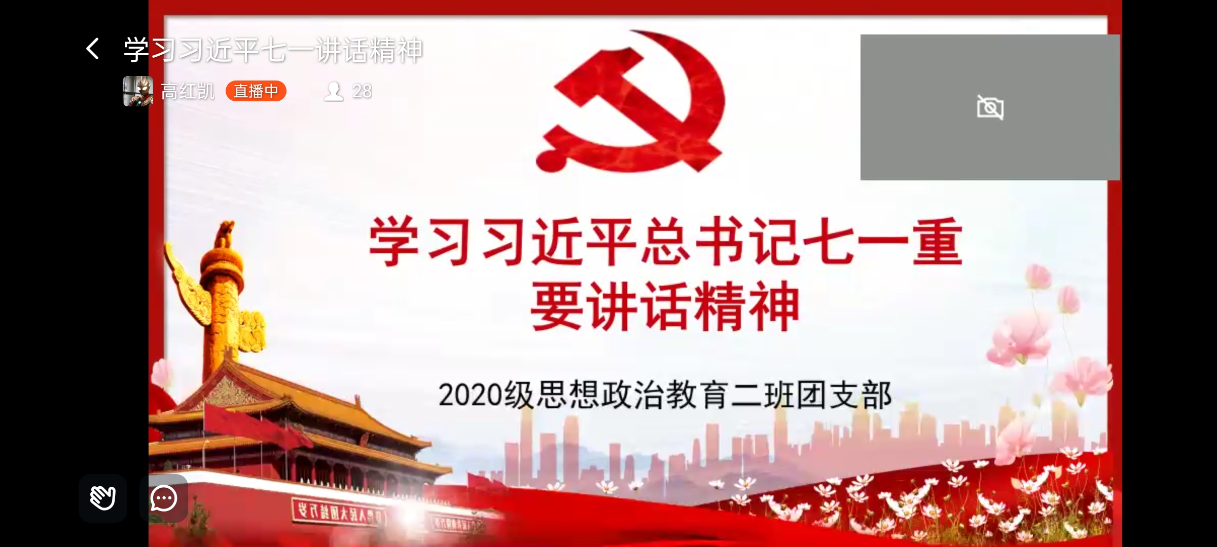 为促使我班团员深入领会习近平总书记“七一”重要讲话精神,感悟百年沧桑巨变、明确自身使命担当,8月12日下午,pp电子官方网站2020级思想政治教育定向二班团支部学习习近平总书记“七一”重要讲话精神主题线上团日活动通过钉钉直播顺利开展。定向二班团支部全体团员参与本次活动。活动由班长高红凯主持。