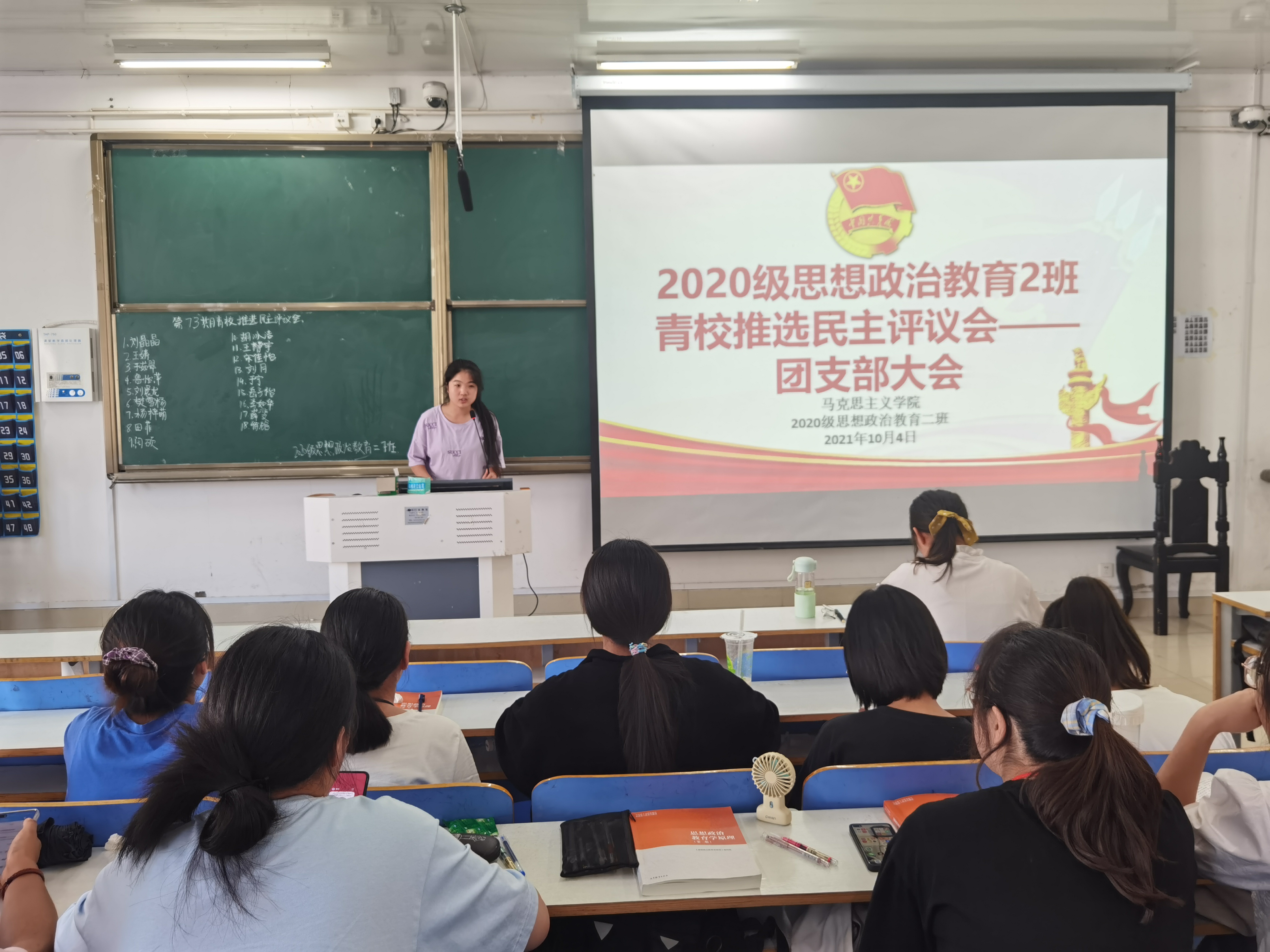 10月4日上午,pp电子官方网站思想政治教育二班在社科楼516教室顺利召开第73期青校学员推选民主评选团支部大会。2020级思想政治教育二班全体团员共同参加本次会议。会议由孙雪主持。