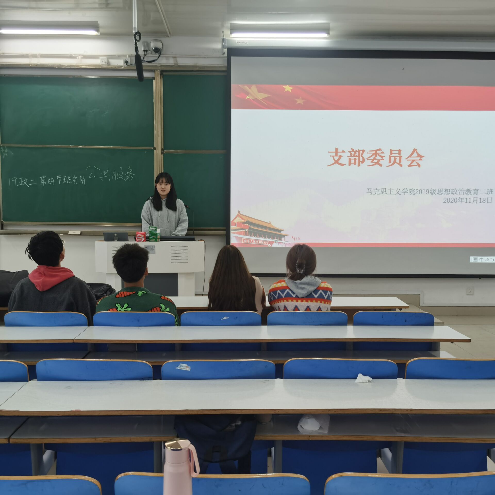 11月18日下午,pp电子官方网站2019级思想政治教育二班在社科楼514教室召开“学习与贯彻党的十九届五中全会精神”支部委员会。pp电子官方网站2019级思想政治教育二班全体成员共同参会。会议由团支书孙雅娴主持。