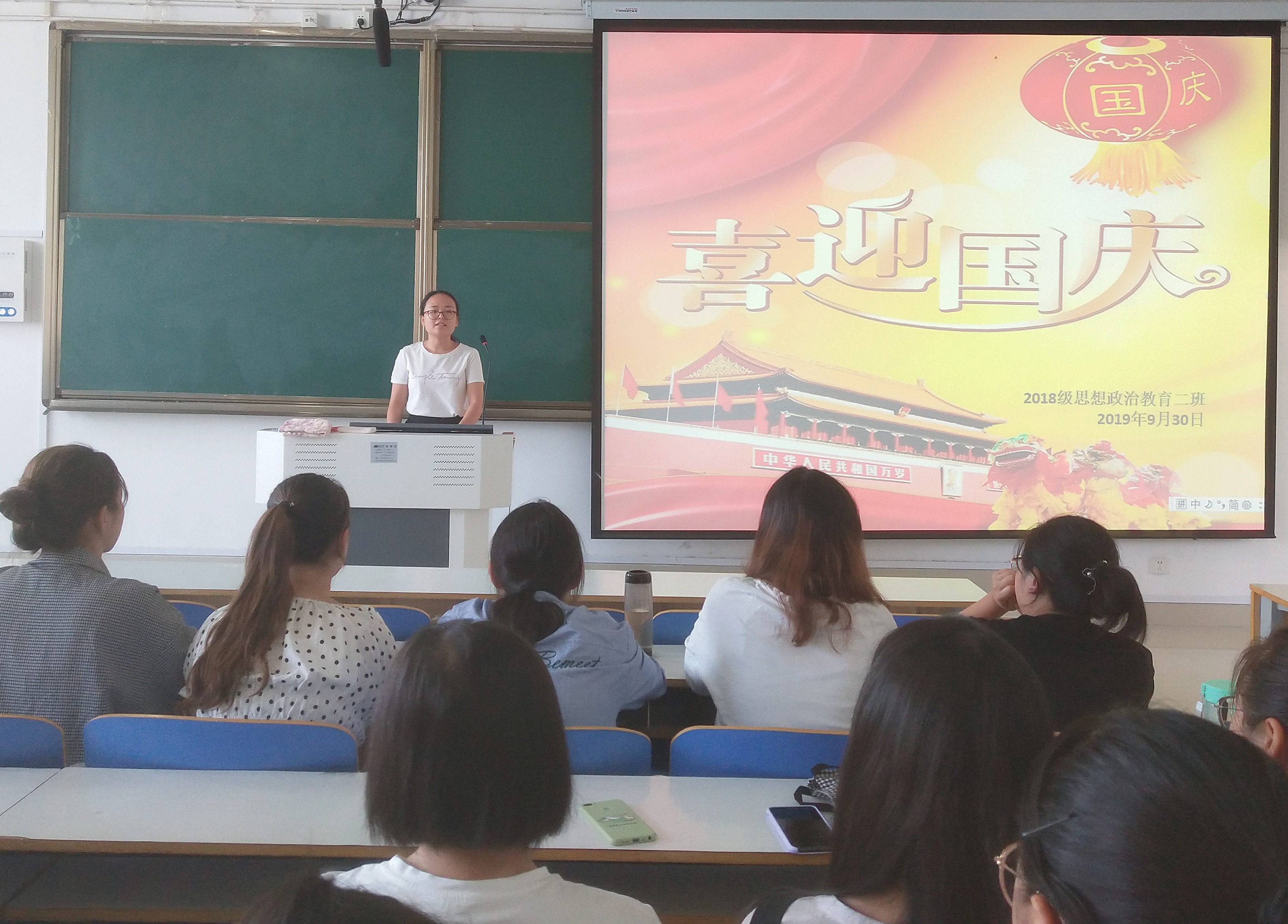 9月30日上午,pp电子官网2018级思想政治教育二班在社科楼514教室开展了“喜迎祖国七十华诞”主题班会。辅导员曹菁菁、2018级思想政治教育二班全体成员共同参加了本次班会。班会由班长杨康主持。