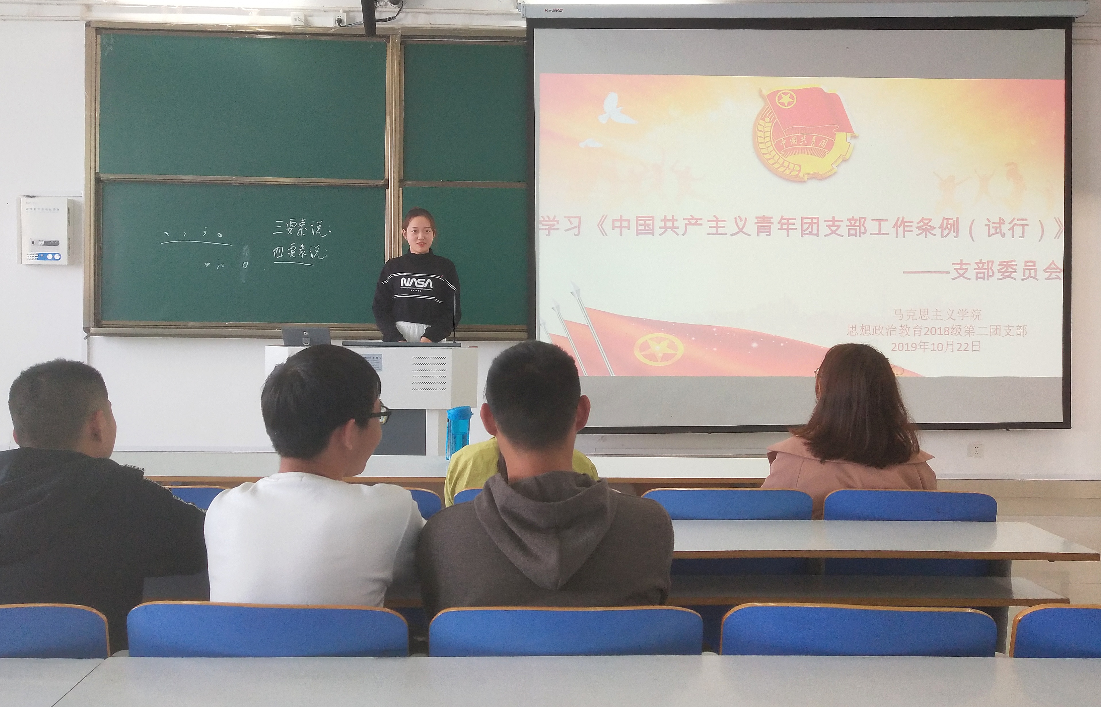 10月22日上午,pp电子官网2018级思想政治教育第二团支部在社科楼514教室顺利开展了主题为“学习《中国共产主义青年团支部工作条例(试行)》”支部委员会。会议由团支部书记黄子晋主持。