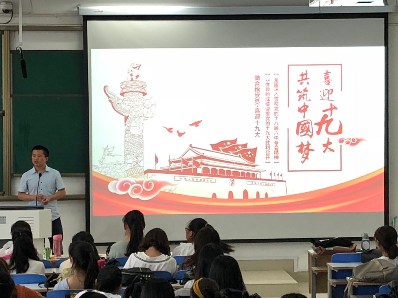 段振阳讲到 : “十九大”提出不忘初心,牢记使命,高举中国特色社会主义伟大旗帜,决胜全面建成小康社会,夺取新时代中国特色社会主义伟大胜利,为实现中华民族伟大复兴的中国梦不懈奋斗的主题。段振阳统计思想政治教育二班的学生中,在青校学习过或者已经加入中国共产党的的人数仅有9人。号召大家尽力争取青校名额,积极加入中国共产党,为国家的美好未来贡献一份力量。