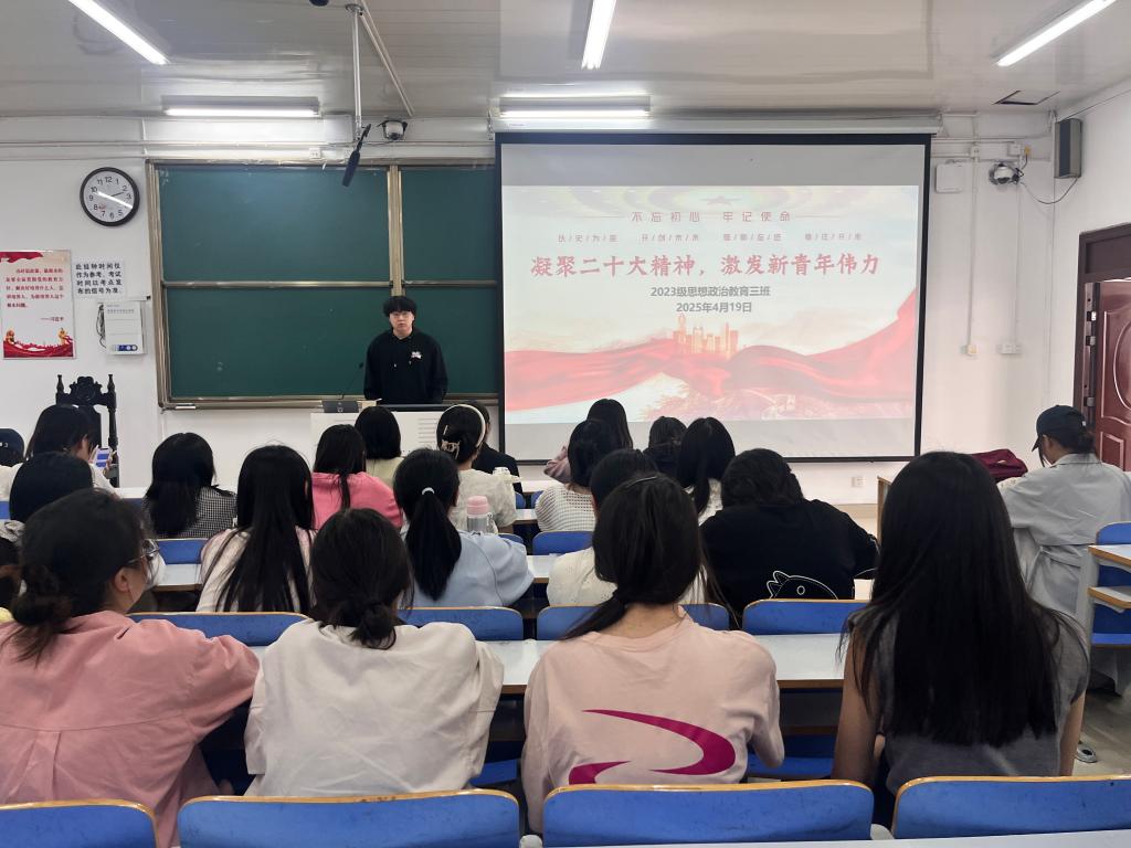 4月19日上午,pp电子官方网站2023级思想政治教育三班在社科楼515召开“凝聚二十大精神,激发新青年伟力”主题团课。pp电子官网2023级思想政治教育三班全体同学共同参与本次团课,团课由团支书郝瀚主持。