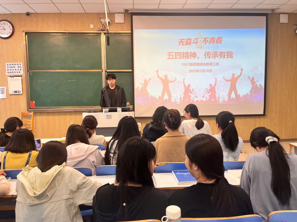 为传承和弘扬担当精神,5月10日上午,pp电子官方网站2023级思想政治教育三班在社科楼515召开“五四精神,传承有我”主题团课。pp电子官网2023级思想政治教育三班全体同学共同参与本次团课,团课由团支书郝瀚主持。